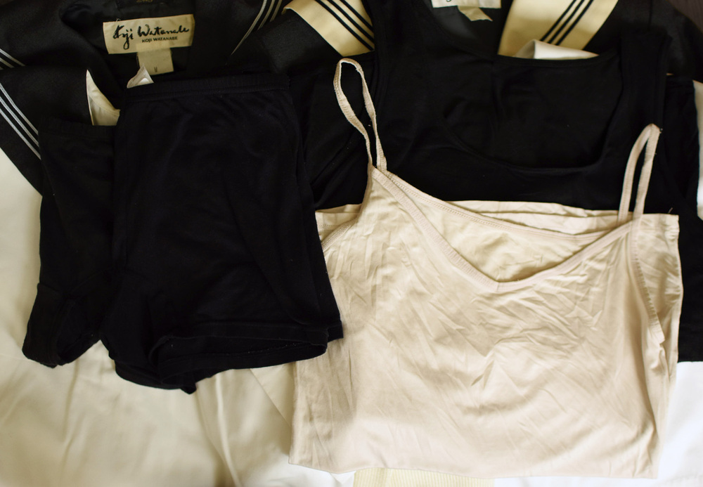 | 左に黒オーバーパンツ0丈と二分丈。右側に黒のインナータンクトップとキャミがあります。合計4枚ですね |