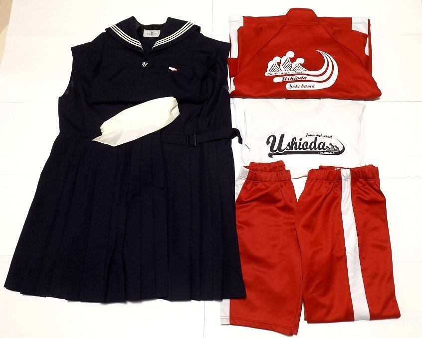 ★神奈川県横浜市立潮田中学校 女子制服セット(冬セーラー+ジャンスカ2種+体操着一式4点+スカーフ)になります。
