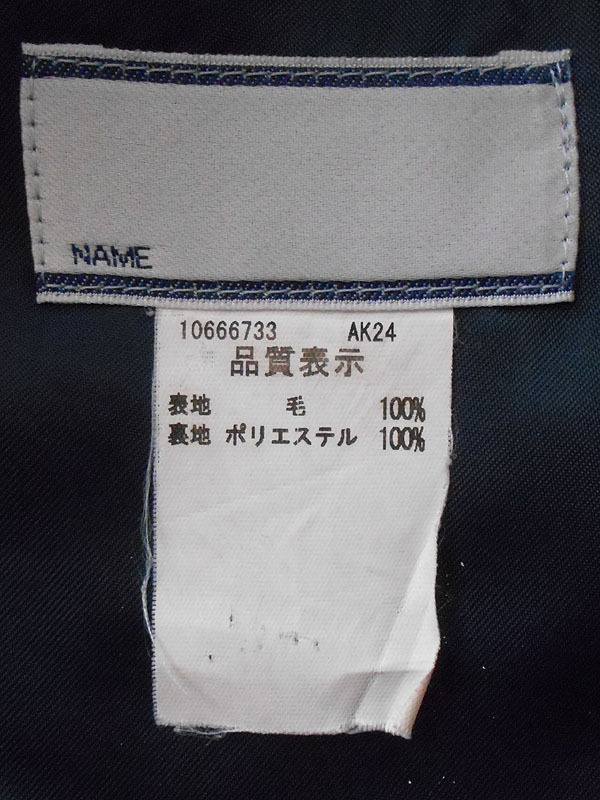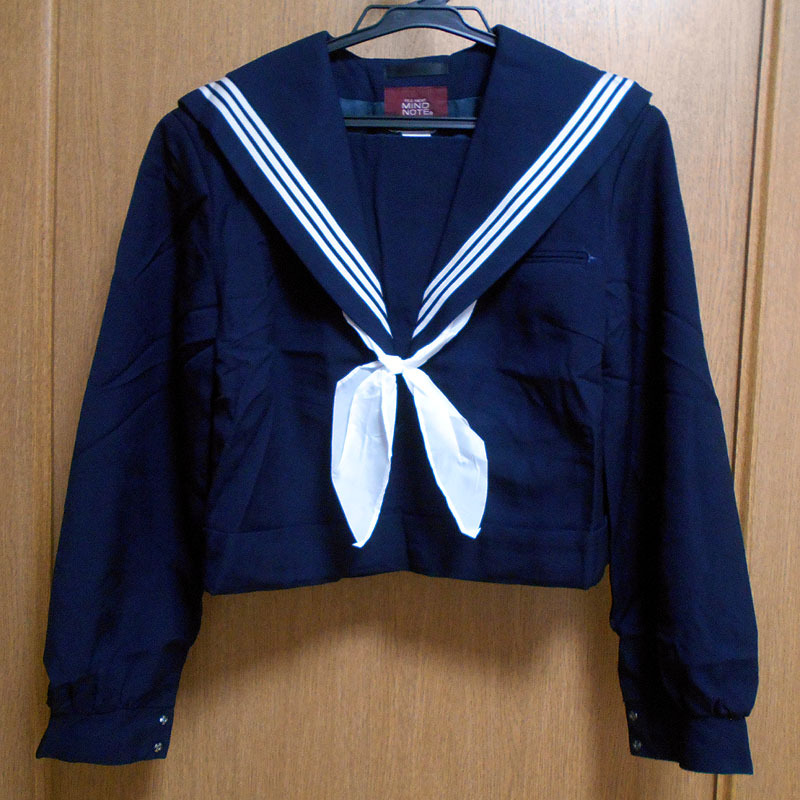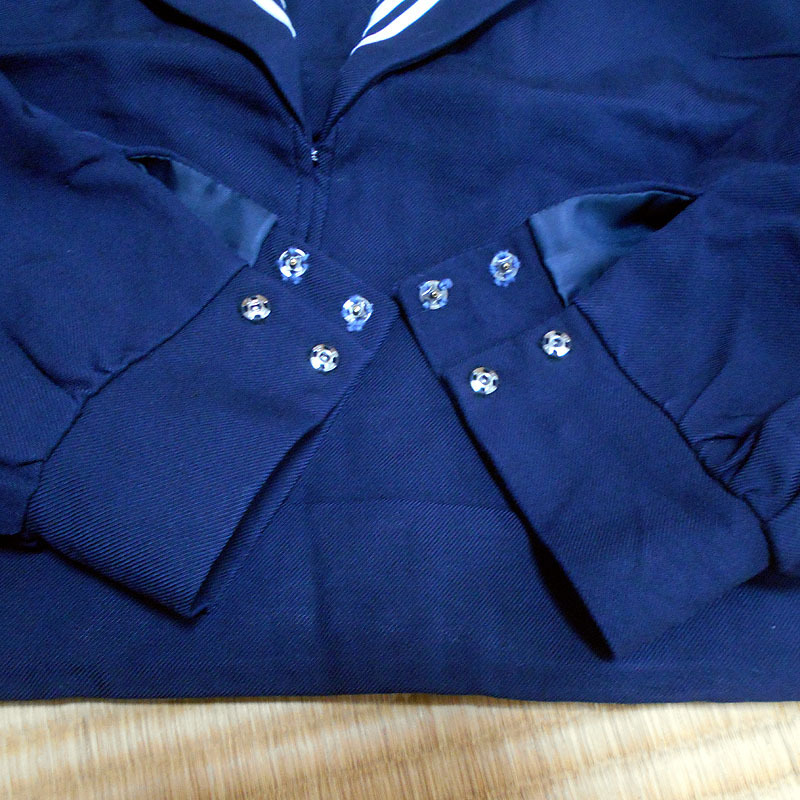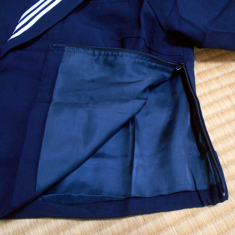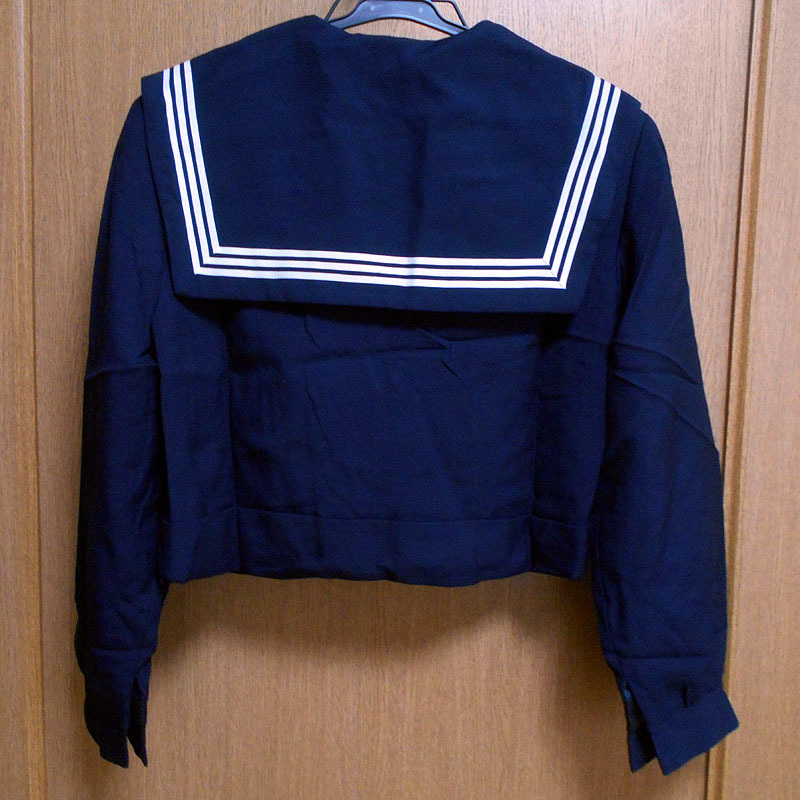 | ブラウンさん、お待たせしました。制服の情報をお伝えします。@裏地の有無→裏地はあります。ポリエステル100%のツルツルの紺色の生地です。A胸あて部分の裏地の有無→胸あて部分にも裏地はあります。生地はポリエステル100%の紺色です。B正面を平置きにして襟を上に伸ばした状態の長さ〜首の中心の縫い目から下端まで→22.5cmあります。C襟下端の左右の長さ→33.5cmあります。Dセーラーカラーのラインの太さ→1本あたり5mm、3本で23mmです。ご検討、よろしくお願いいたします。 |