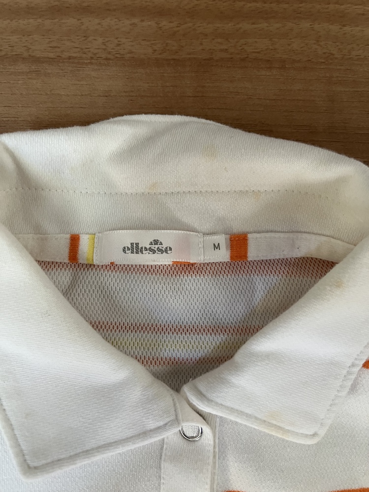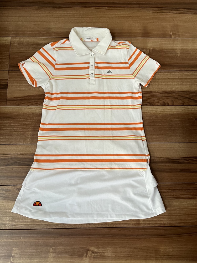 テニスの上下セットアップです。 スカートはインナー無しのスカートタイプです。 上下とも若干透けます。 サイズはMです。スカート丈は33センチ、ウエストはゴムになっています。 襟の内側が少し黄ばみありです。 |