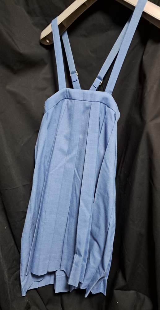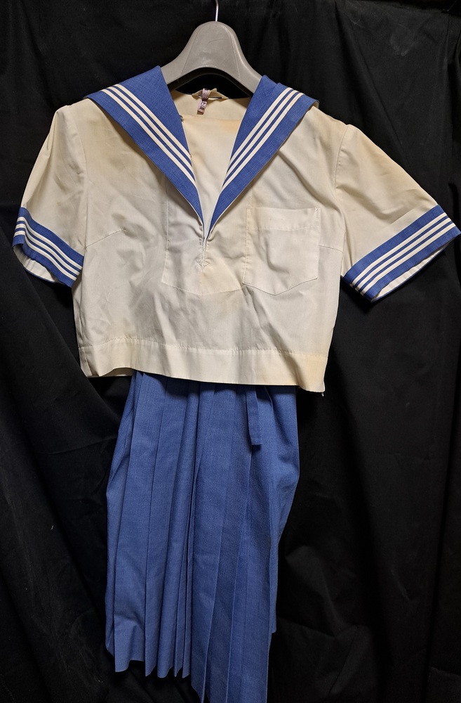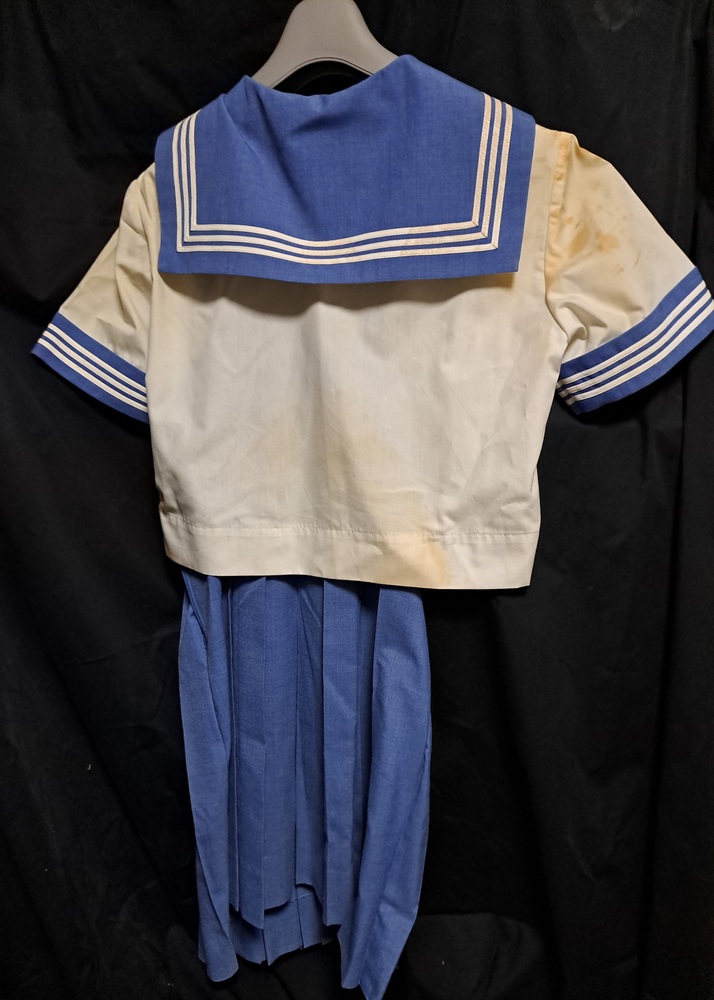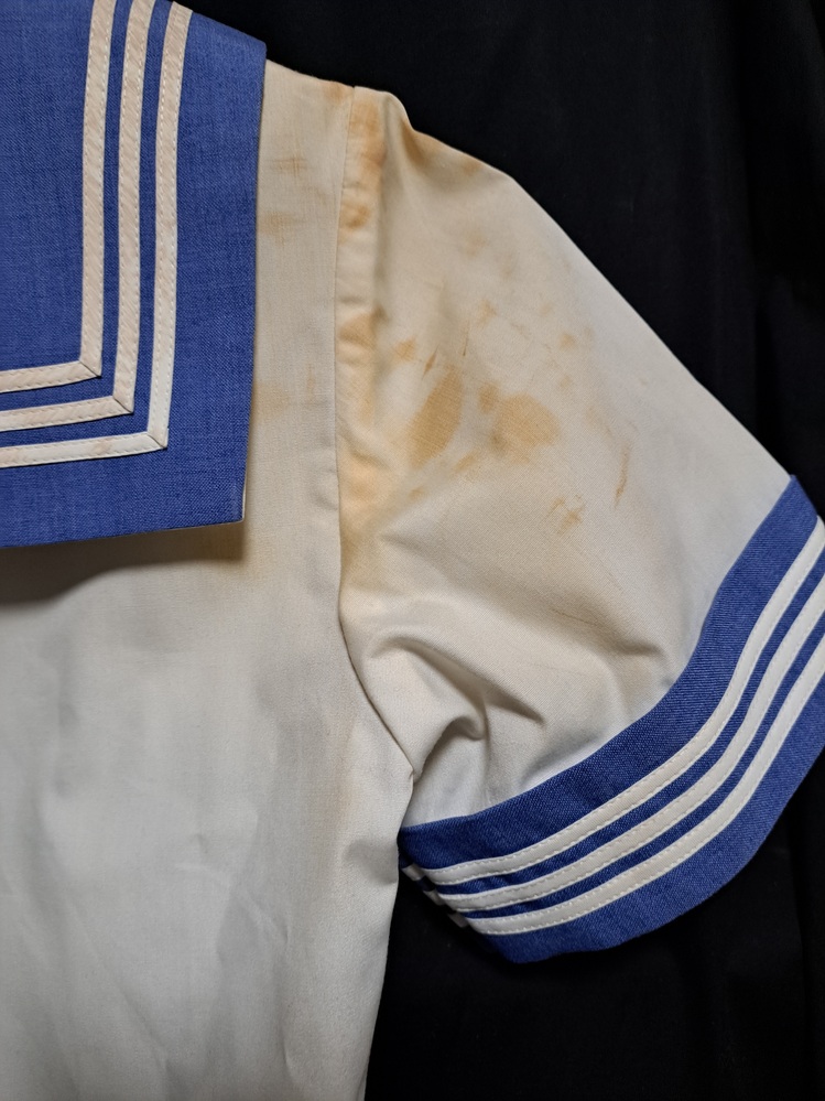 自己紹介を一読してからの入札、お願いいたします。 夏セーラー服 水色襟、水色スカート 上着 右袖、胸当て上部、背中、下部に茶色い汚れあり 日焼け状で業者クリーニングでも落ちません。 肩幅 約38センチ 胸囲 約86センチ 袖下 約7センチ 着丈 約43センチ 吊りスカート 23本前箱ヒダ 毛50% ポリエステル50% ウエスト 約68センチ 着丈 約58センチ |