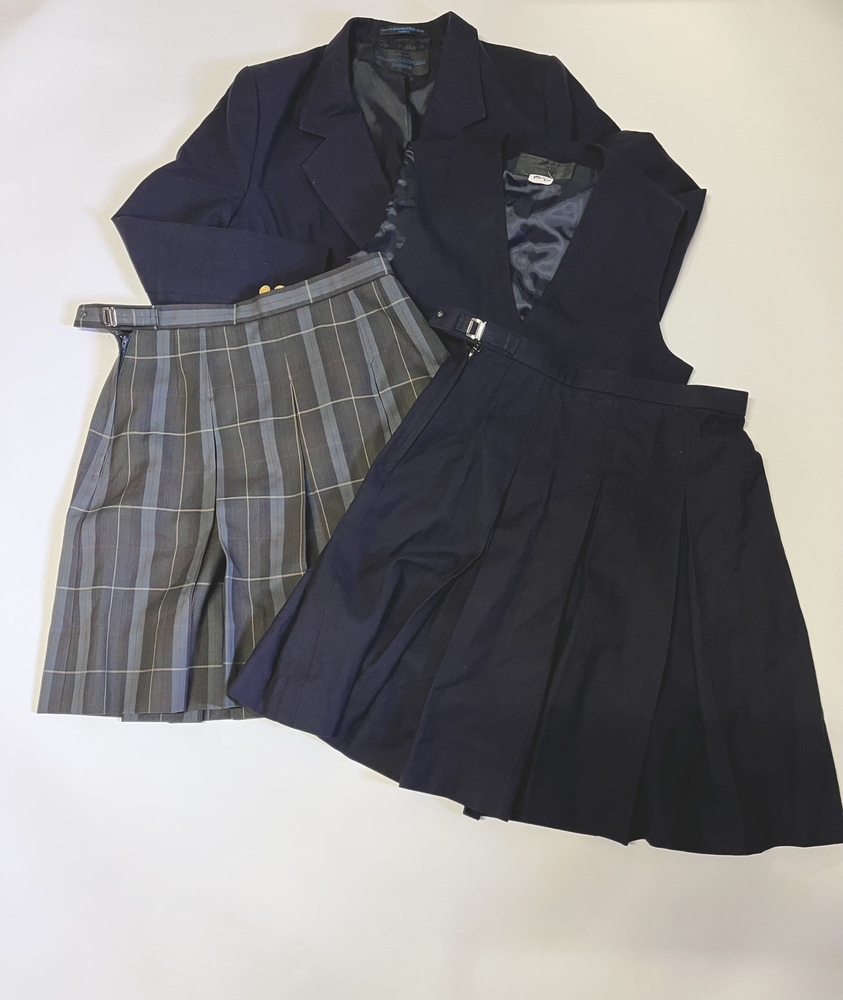 セット内容は、ブレザー、ベスト、冬スカート、夏スカートの4点です。 サイズは平置きで ブレザーが幅47センチ、丈50センチ。(1番短いところで) ベストが幅46センチ、丈46センチ。 冬スカートがウエスト72センチ、丈50センチ。 夏スカートがウエスト72センチ、丈53センチです。 |
