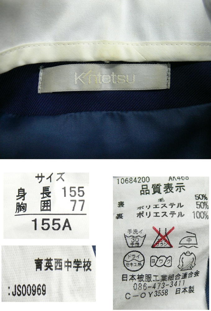 いたずら入札が多く困っています! 新規の方、評価5以下の方は購入意思確認の為コメント入れてください。 ない場合は削除します。 また、ご落札後は24時間以内に落札連絡お願いします。 お支払はご落札後5日以内にてお願い致します。 ご連絡無しで過ぎた場合、落札を取り消しいたしますのでご注意ください。 ご覧いただきありがとうございます 奈良育英西中学校 *商品説明* ◆白エリカバー付の青系ブレザー1枚 青系冬スカート1枚 組章付 すべて指定品 ◆ブレザー刺繍 *サイズ* 《ブレザー》155A 肩幅 37cm 身幅 46cm 着丈 51cm 袖丈 55cm 《冬スカート》 ウエスト 56〜60cm 丈 57cm *状態* ランク C ブレザーに毛玉があります。 後ろに1ヵ所破れがあります。 両袖口にわずかな擦り切れがあります。 エリカバーに黄ばみがあります。 *発送* 60サイズの段ボールで大阪よりお送りします。 品名『衣類』と記載します。 ヤマト宅急便 全サイズ一律850円 (北海道・沖縄を除く) 【北海道】 60サイズ 1700円 80サイズ 2000円 【沖 縄】 60サイズ 1260円 80サイズ 1870円 ☆発送は火・水・金です。 月・木・土・日・祝日は発送お休みです。 ☆火・水・金曜日はお昼12時までに 入金を確認出来ましたら その日にお送りいたします。 それ以降の時間のものは翌発送日になります。 ☆センター止め可能です。 ご希望の際はセンターコードをお知らせください。 ☆お時間帯指定可能です。 @午前中A14〜16時B16〜18時 C18〜20時D19〜21時 ☆同梱発送可能です。 取引メッセージでご連絡お願いします。 *注意事項* ◎落札後24時間以内にご連絡がとれる方の ご入札お待ちしております♪ ◎ノークレーム・ノーキャンセル・ ノーリターンでお願いします。 ◎お取り置きは最初の商品の落札日を含め5日以内と させていただきます。 ◎お支払いは三井住友銀行指定口座へ 『落札額+上記送料』お振込みお願いいたします。 ■メッセージ・ご質問などへのお返事 火・水・金の10時〜14時 ■発送 火・水・金 |