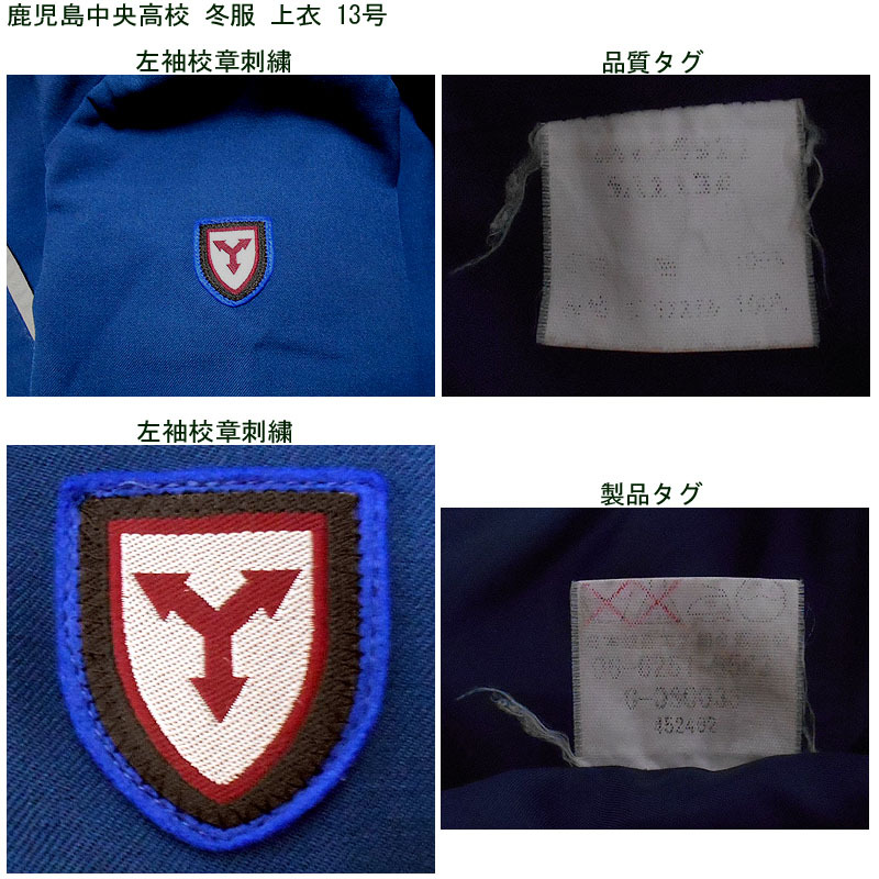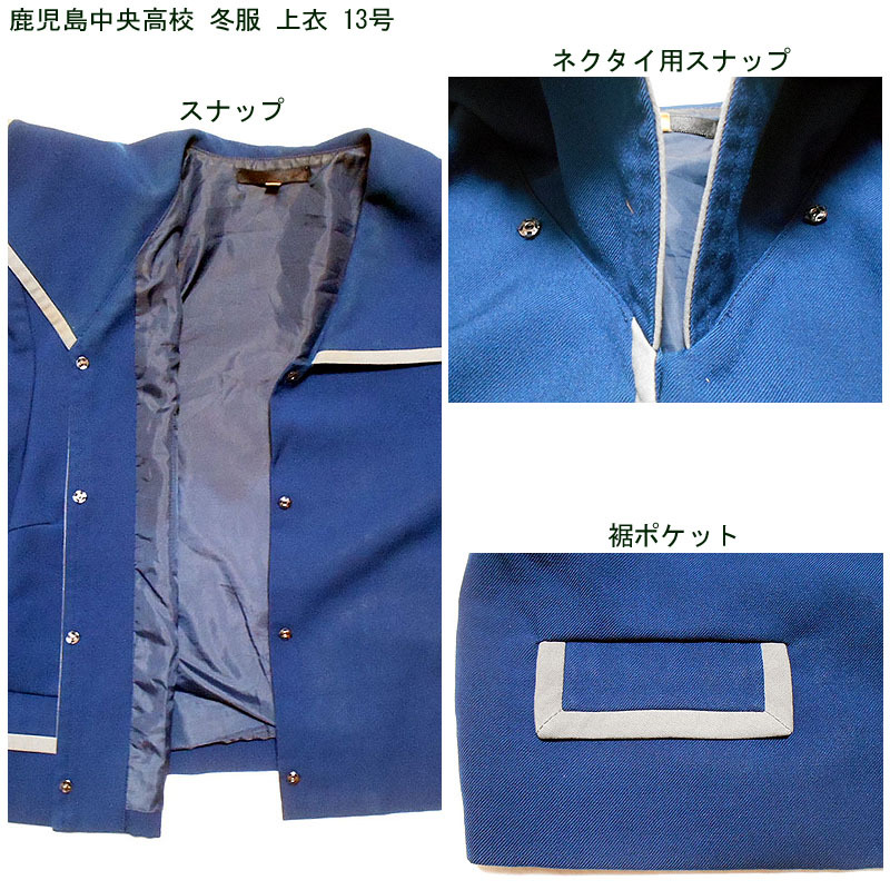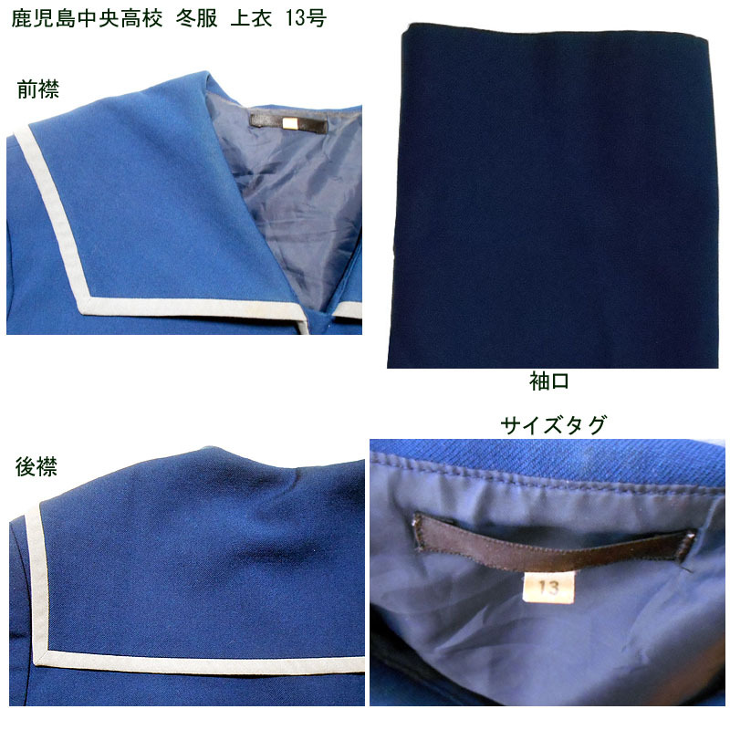 鹿児島県立鹿児島中央高校の制服で、冬服上衣のみになります。 制服の色は瑠璃色で、台形の前襟が特徴です。 スナップ留めのネクタイは欠品です。ご了承ください。 裾ポケットが2つあり、襟と同じように灰色のラインで縁取られています。 左袖に校章のワッペンがあります。 ●商品の説明 メーカー:- 色/タイプ:瑠璃地瑠璃灰色縁線長袖前開 サイズ:13 肩幅:43p 胸周り:108p 袖丈:58p 着丈(首後ろから):45.5p 裾廻り:102cm ※素人採寸ですので、多少の誤差はご了承ください。 ●注意事項 (1)ホームクリーニング済みです。 (2)実際に着用されていた制服ですので、シミ、汚れなどがあります。 (3)虫食い防止のため衣類の圧縮袋で保管していましたので、多少シワがあります。 (4)ノークレーム、ノーリターンでお願いいたします。 (5)スムーズな取引を心がけますが、発送は週末になります。 |