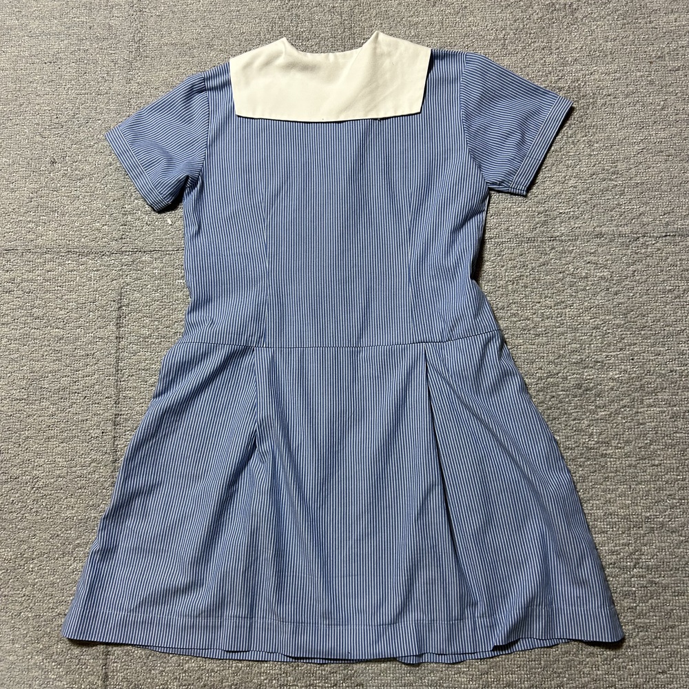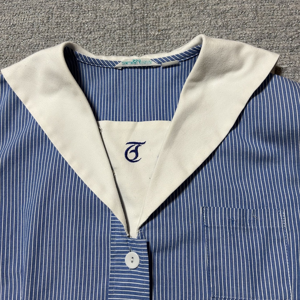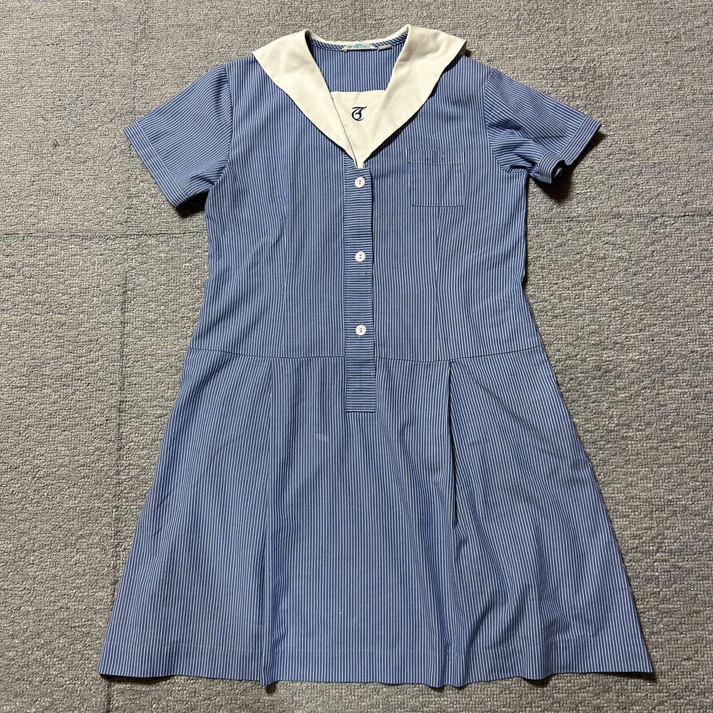 小学校制服 半袖 セーラー襟ワンピース 学校名は不明ですが、胸当ての校章マーク刺繍よりご判断ください 平置きで 身幅 49pくらい 着丈 88pくらい 肩幅 41pくらい 表側は若干の使用感はあるものの目立つような汚れや傷等のダメージはありませんが、裏側の縫い目、ミシン目はずれ箇所があり、簡単補修しております |