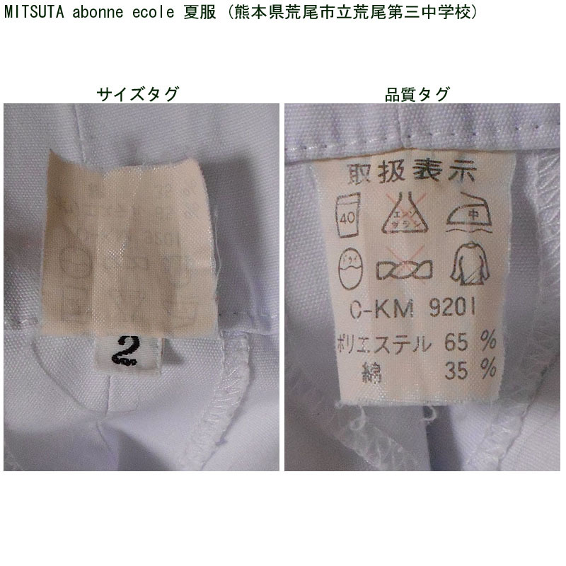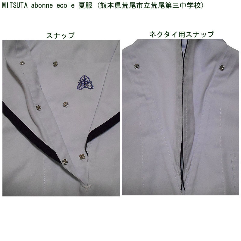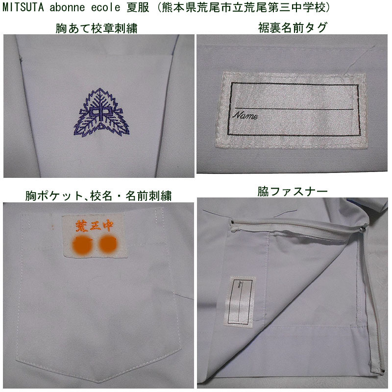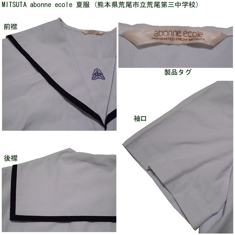 熊本県荒尾市立荒尾第三中学校の夏服のセーラー服になります。 MITSUTA abonne ecole製です。 胸あてに校章刺繍があります。名前刺繍が入っています。 かなり大きめなので、ゆったり着用できます。 ●商品の説明 メーカー:MITSUTA abonne ecole 色/タイプ:白地白襟黒1線半袖被り(関西襟) サイズ:2 肩幅:45.5p 胸周り:114p 半袖丈:22.5cm 着丈(首後ろから):47cm 裾廻り:108cm ※素人採寸ですので、多少の誤差はご了承ください。 ●注意事項 (1)ホームクリーニング済みです。 (2)実際に着用されていた制服ですので、シミ、汚れなどがあります。 (3)虫食い防止のため衣類の圧縮袋で保管していましたので、多少シワがあります。 (4)ノークレーム、ノーリターンでお願いいたします。 (5)スムーズな取引を心がけますが、発送は週末になります。 |