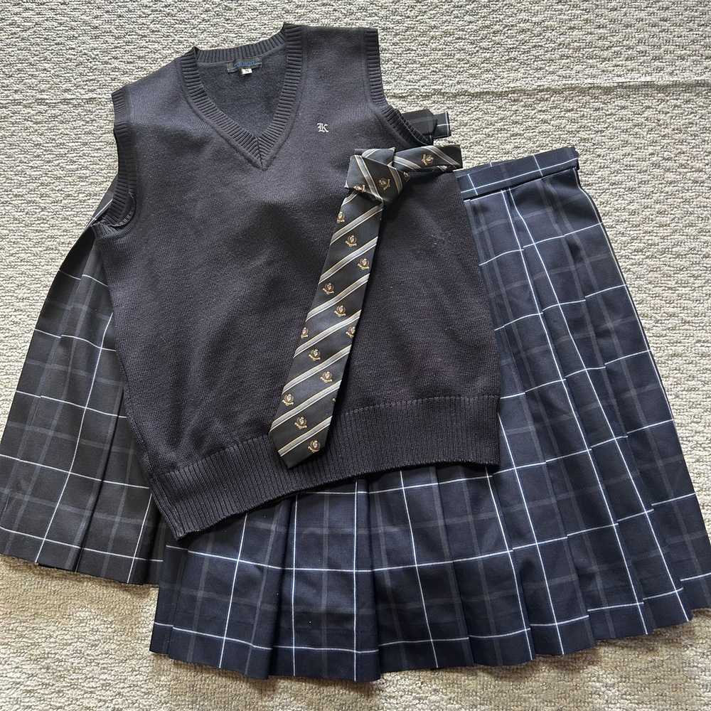 駒込高校制服 明石スクールユニフォーム 冬用スカート 1枚 夏用スカート 1枚 ウエスト 69p(調節可能) スカート丈 ベルト下51p ベスト サイズ M 平置きで 身幅 45pくらい 着丈 59pくらい ネクタイ 1本 HANECTONE いずれも目立つような汚れや傷等のダメージはありませんが、若干の使用感はあるかと思います |
