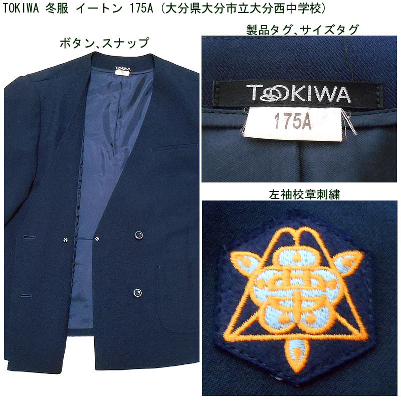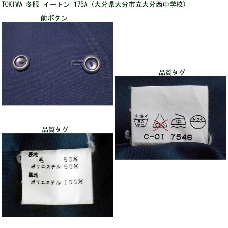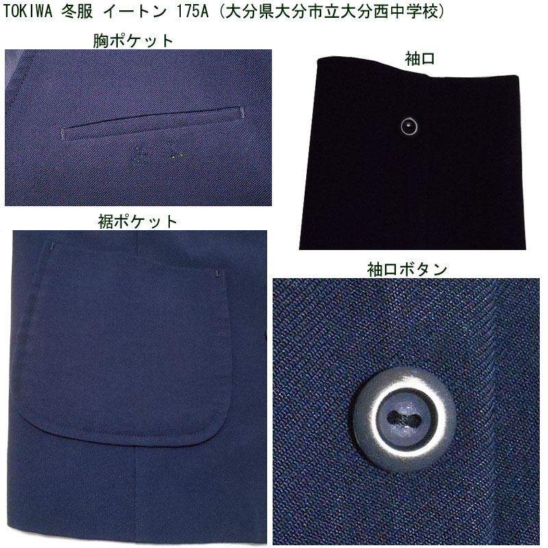 大分県大分市立大分西中学校の冬服イートンの上衣です。 メーカーはTOKIWAです。 大きめの制服になります。 ●商品の説明 メーカー:TOKIWA 色/タイプ:紺地長袖前開 サイズ:175A 胸廻り:114cm 肩幅:44cm 袖丈:59.5cm 着丈(首後ろから):63cm 裾廻り:112cm ※素人採寸ですので、多少の誤差はご了承ください。 ●注意事項 (1)ホームクリーニング済です。 (2)実際に着用されていた制服ですので、シミ、汚れなどがあります。 (3)虫食い防止のため衣類の圧縮袋で保管していましたので、多少シワがあります。 (4)ノークレーム、ノーリターンでお願いいたします。 (5)スムーズな取引を心がけますが、発送は週末になります。 |