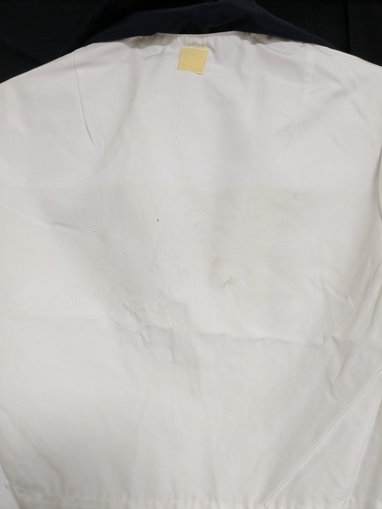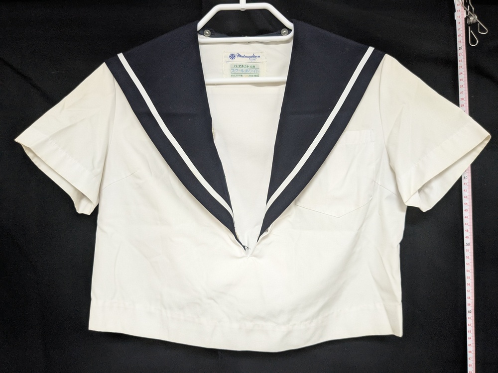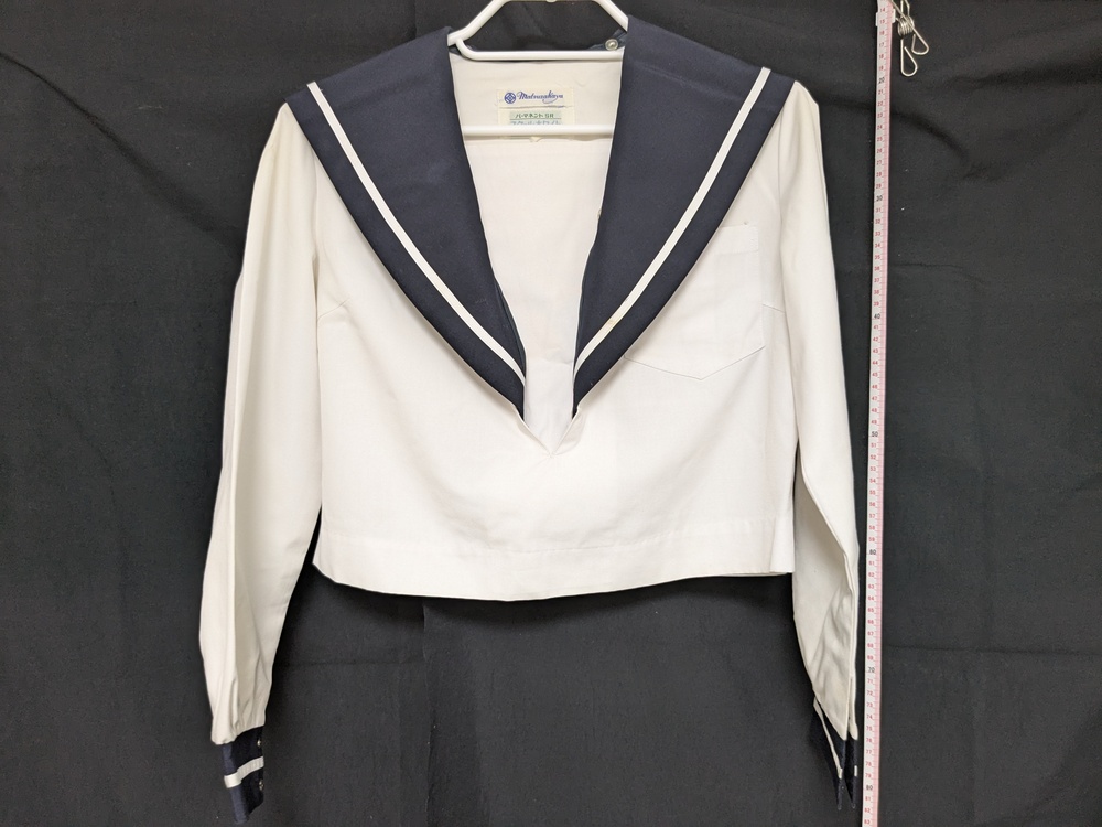 肩幅は袖上(肩)左右縫い目間距離、身幅は袖下(脇)縫い目間距離、袖丈は袖上(肩)縫い目から袖口腹側折り目までの距離、着丈は襟(首裏)中央から裾中央までの距離となっております。 - 夏服(白半袖)