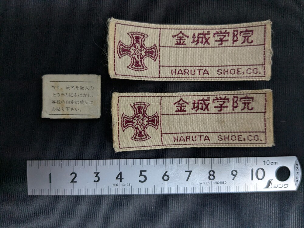 校章、校名が刺繍された布製シール2点帯付です。帯に「ハルタ製靴(株)」と記載があります。かばんの小ポケットに入れておきます。