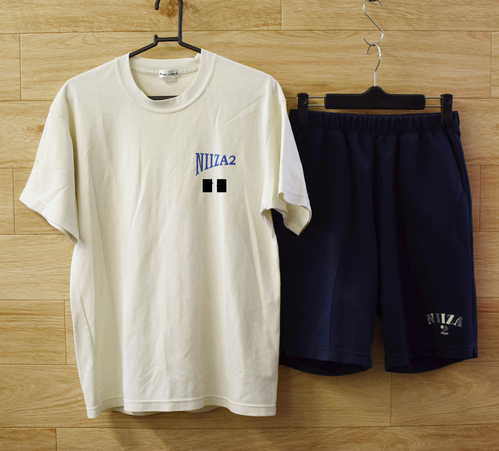 体操着のパンツのウエスト紐がありません。ロゴプリントに擦れ、黄ばみ・着用感があります。