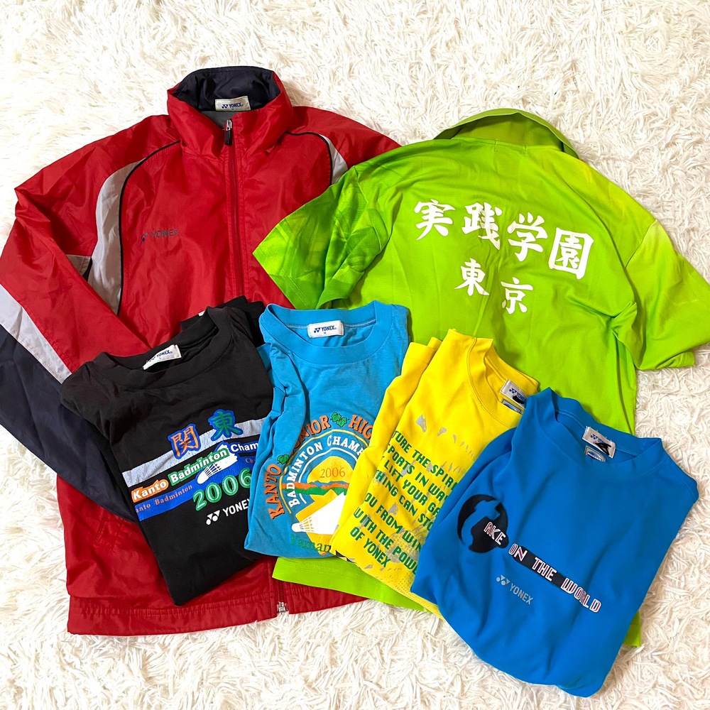 ご覧いただきありがとうございます☆ ★商品について★ @ポロシャツ M (実寸サイズ:肩幅:約45cm身幅:約48cm 袖丈:約21cm 着丈:約65cm) AからD ヨネックス tシャツ ✖️4枚 Eジャージ上 M 実寸サイズ:裄丈:約81cm身幅:約57cm 着丈:約70.cm) ネーム刺繍が入っています。 裾にダメージがあります。 目立つダメージやヨゴレ以外は記載を省略する場合がございます。 発送はクロネコヤマト 送料は800円です。(沖縄、離島は着払いです) |