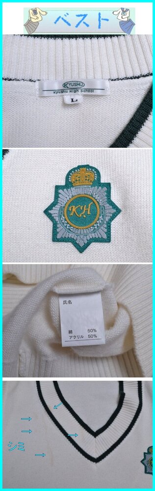▲fss-4942 九州高校(大きめ)▲ ■■商品説明■■ ●ブレザー:15R 肩幅42cm位 着丈65cm位 胸周100cm位 袖丈56cm位 ●ベスト(紺):不明 ●長袖ブラウス:(13胸囲88)肩幅41cm位 着丈56cm位 胸周104cm位 袖丈55cm位 ●冬スカート:ウエスト72-78(表記75)cm位 丈54cm位 20本車プリーツ ●半袖ブラウス:13 肩幅41cm位 着丈68cm位 胸周102cm位 ●ベスト(白):L ●夏スカート:ウエスト72-78(表記75)cm位 丈54cm位 20本車プリーツ ●リボン: ●靴下:2種類 ◎生地 ブレザー【表地】ポリエステル50%毛50%【裏地】ポリエステル100% ベスト(紺)【生地】アクリル70%毛30% 長袖ブラウス【生地】ポリエステル65%綿35% 冬スカート【表地】ポリエステル50%毛50%【裏地】なし 半袖ブラウス【生地】ポリエステル25%綿75% ベスト(白)【生地】アクリル50%綿50% 夏スカート【表地】ポリエステル50%毛50%【裏地】なし ◎メーカー ブレザー:カンコー 長袖ブラウス:カンコー ベスト(紺):牧村 冬スカート:カンコー 半袖ブラウス:カンコー ベスト(白):牧村 夏スカート:カンコー ◎開き ブレザー:前開 長袖ブラウス:前開 冬スカート:左脇ファスナー開 半袖ブラウス:前開 夏スカート:左脇ファスナー開 ◎その他 ベスト(紺)に糸引き箇所あり(画像参照) ベスト(白)にシミあり(画像参照) 所在:福岡市東区 ■■発送について■■ ◇以下はお休みさせて頂きます。予めご了承下さい。 『土、日、祝祭日、8月12日〜16日 12月30日〜1月4日』 ◇基本、ヤマト運輸での発送です。 ■■注意事項■■ ◇気づいた点は記入するようしていますが、見落としで、ホックボタン不足、ホツレ、虫食い、シミ、その他欠陥がある場合があります。 ◇スカートの裏側に小さなシミ等があっても表からは見えませんので、基本的に記載は致しません。 ◇汚れの酷い場合や広範囲にある場合は裏側でも記載致します。気になる場合は入札前にご質問下さい。 (ポケットや裏地の破れは記載致します) ◇出品商品は中古品なので、新品のような完璧な商品をお探しの方は、入札をご遠慮頂き、ご理解下さる方のみ入札をお願い致します。 ◇サイズは一部を除き実寸です。素人が採寸しておりますので、多少の誤差はお許し下さい。 ◇スカート丈はウエストベルトを除いた部分を計測しております。(一部を除く) ◇制服は新品以外は全てドライ用洗濯済(毛100についてはドライクリーニング済)です。 ◇ノークレームでお願いします。 ◇評価に多数のマイナスがある方は入札を取り消させて頂く場合があります。 ◇保管場所の都合により質問の回答にはお時間を頂きますので、お早目にお願いします。 ◇他でも同商品を販売しております。場合によっては出品中でも取消が間に合わずに在庫が無い事があります。 ◇出品商品は、公開画像以外にも画像を残しております。 ◇その他、ご質問があればお気軽にどうぞ!! |