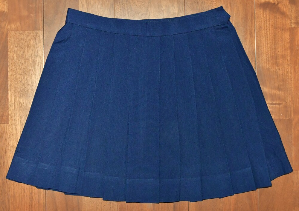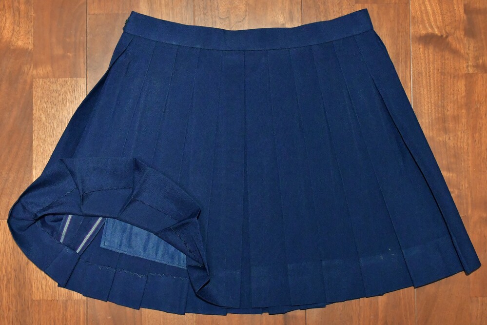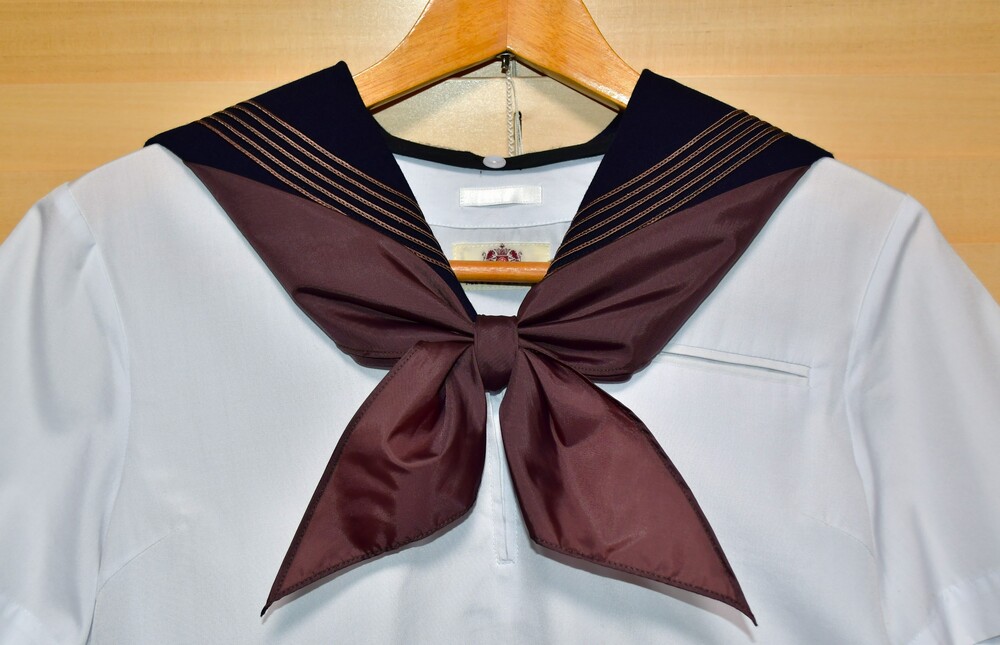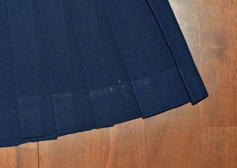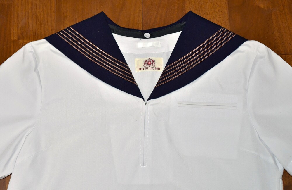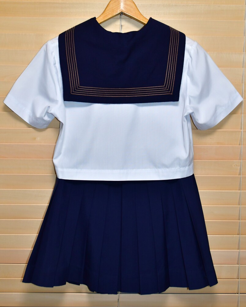 【 はじめに 】 ご入札前に必ず、自己紹介文の注意事項をよくお読み下さい! 入札された方は、内容を全てご理解頂いたものと解釈致しますので、宜しくお願いします。 【※おことわり】 ※当該品は今年の春にも出品していましたが、今回は出品内容の一部を変更し、また撮り直しを行った為、新規扱いとさせて頂いております。 予めご了承下さい。 【 出品物概要 】 ●東京都国立市の公立校、第五商業の旧セーラー服です。 その校名は、襟のラインに極めて珍しい5本線を採用する、最後の生き残り校として知られていました (※注1)。 地元では大変人気があり、生徒にも愛着を持たれていたセーラー服ですが、2000年にブレザーへMCとなってしまい、残念ながら5本線襟のセーラー校は絶滅してしまいました。 ●現在も僅少ながら、中古リサイクル市場で見られる五商のセーラー服は、メーカーのほぼ99%が『 TAKANO 』製となっていますが、今回は極めて稀な『 三越 』製を出品致します! 特徴としては、『 TAKANO 』製の襟ラインが赤色系で5本の間隔が狭いのに対し、『 三越 』製は茶色系で5本の間隔が広く、また『 TAKANO 』製よりも後襟が若干縦深くなっています。 実際に現役当時も、そのシェアは『 TAKANO 』製を着用する生徒さんの方が多数を占めていて、『 三越 』製は少数派だった模様です。 理由として、一説には『 MITSUKOSHI 』製の方が高額であった為とも言われています。 ●もう一つ、五商のセーラー服を語る上で欠かせないのが、通称 “五商結び”。 スカーフを襟に被せて結ぶその形は、蝶の様に可憐で、五商セーラー服の魅力を更に引き立てる、秀逸なアレンジでした。 当時殆どの生徒さんは、これを大きめに結んでいて、遠目からも随分と目立っていた様です (※注2)。 〇上衣裏側生地の一部に “ほつれ” が見られますが、ミシン目から先、布余り部分にあたる為、今のところ本体に影響はありません。 〇スカートは指定外の為、オマケ扱いではありますが、縫製によるミニ丈仕立てにリメイクされています。 後ろ側の一部に、取れない小さな塊汚れがありますが、遠目からはあまり気付かないレベルかと思われます。 〇全てクリーニング済みです。 〇送料無料サービス致します! ▽肩幅 40センチ ▽着丈 40センチ (製造当初から短い) ▽胸囲 95センチ ▽袖丈 21センチ ▽スカート総丈 38センチ (ベルト部分3センチを含む) ▽スカートウエスト (三段式ホック⇒) 70・71・72センチ ▽前広ヒダ 22本 ▽ウール 50%、ポリエステル 50% ○素人採寸の為、若干の誤差はご了承下さい。 採寸数値から見て、大体 「160A〜165A」 辺りかと思われます。 ●当該校のセーラー服は、廃止から既に25年が経過し、中古として出回る事も少ない激レアの制服と化していますが、その中でも今回の『 MITSUKOSHI 』製は、絶滅危惧種の最上級クラスと言っても良いでしょう。 次はいつ出て来るか見当もつかない程の、滅多に無いチャンスですので、絶対にお見逃しなく! (※注1:大昔には全国で、もう2校程存在した模様 ) (※注2:現在関東で同様な蝶結びをしているセーラー校は、神奈川学園中学 《スカーフ留めタイプを含めると、聖和学院・川越西高校・二松学舎大付属高校》 位しかなく、近年では希少な存在 )