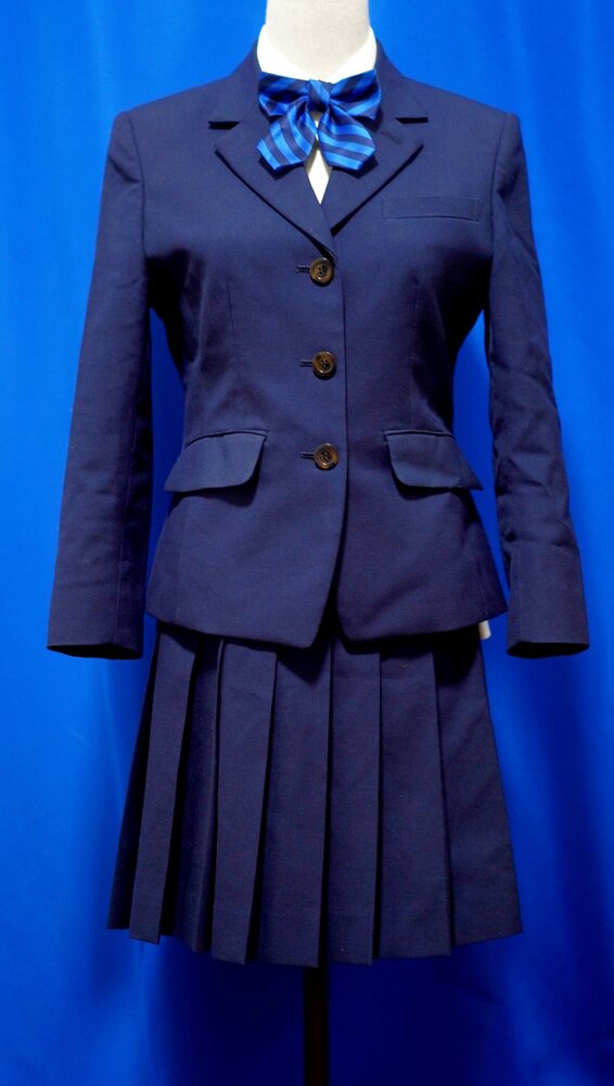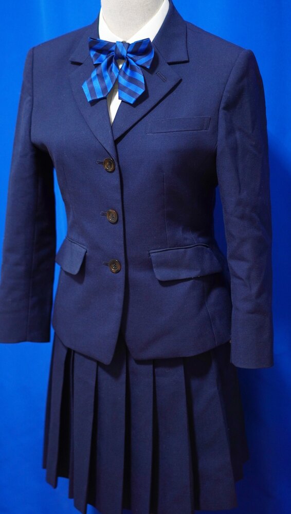冬服は濃紺のブレザーに同色のスカートを着用します。学年ごとで色の違うリボンを付けます。