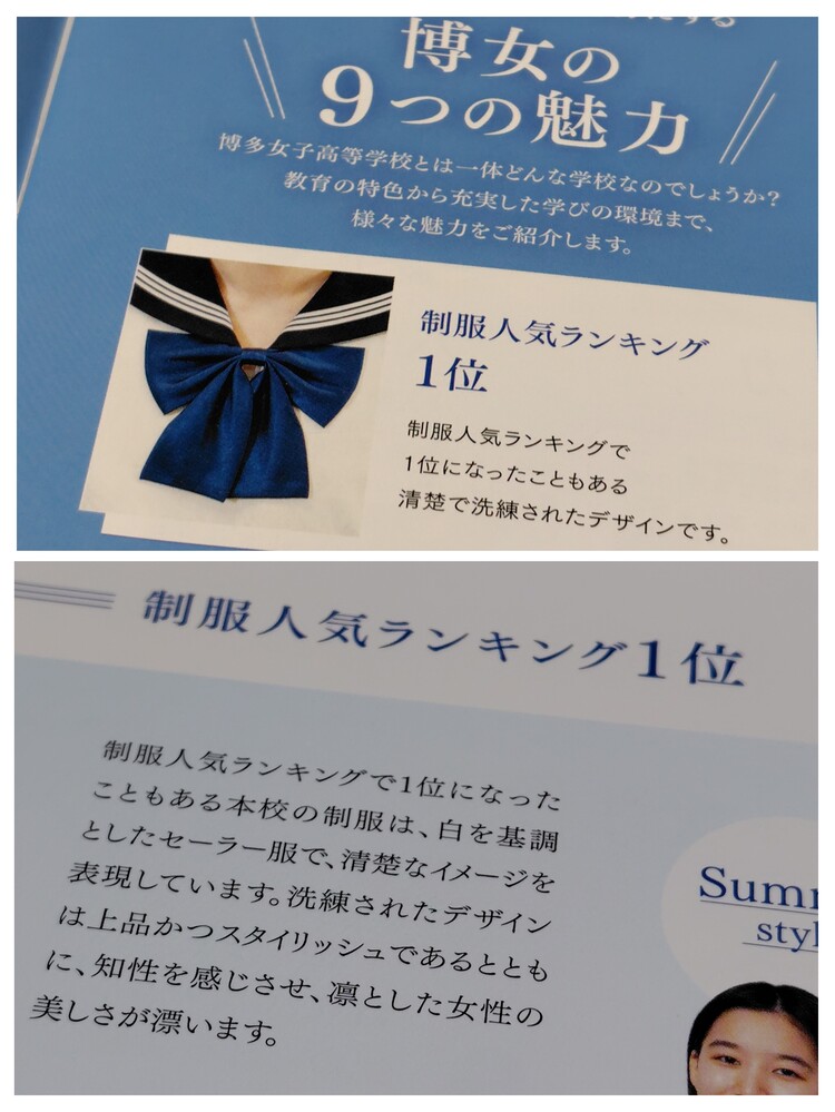※スマホでご覧の方は「Read More」を押すと商品説明が全文表示されます。 【お知らせ】 これから随時、来年度向けのパンフレットを出品させていただきます。 中には、限定のグッズもございます。 《セーラー祭り 開催中!!》 セーラー服のパンフレットを毎週出品。 第3週目からのおすすめは『西日本セーラー』です。 西日本中心のセーラーを集めました。 新しいセーラーに出会えるチャンスです! 順次出品していきますので、お楽しみに☆ 1週目、2週目の人気セーラーや、 セーラー以外の人気商品もアンコール再出品します。 出品の終了日時は、毎週土曜日の夜9時です。 ぜひ、定期的にチェックしてみてくださいね。 ※現在出品中の商品はコチラ https://seifuku-ichiba.com/search.cgi?acc=sell_list&sid=1620050768 ※商品説明欄の一番下にも現在出品中の商品リンクを張ってありますので、そこからもご覧いただけます。 −−−−−−−−−−−−−−−−−−−−−−−−−−−−−−−−−−−−−−−−−− 商品に興味をもっていただき、ありがとうございます。 以下をお読みいただき、入札をお待ちしています。 《セーラー祭り☆開催中》 福岡県の私立女子校 博多女子高等学校の最新パンフレット(2026年度版) です。 制服人気ランキング1位☆の女子校です。 博多女子高等学校の制服は、白色のセーラー服が特徴で、紺色のプリーツスカートと合わせるスタイルです。 夏服・冬服ともにこの基本スタイルで、上品でかわいいと評判が高いです。