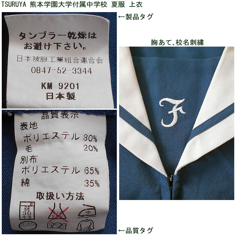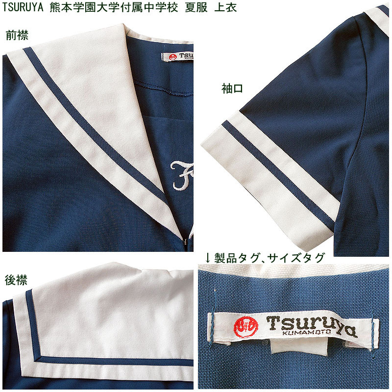 熊本県私立熊本学園大学付属中学校の夏服のセーラー服の上衣になります。 鶴屋百貨店製になります。 胸あてに校名刺繍があります。 襟部分は若干の黄ばみがあります。 ワンタッチリボン(白)はありません。ご了承ください。 ●商品の説明 メーカー:TSURUYA(鶴屋百貨店) 色/タイプ:くすみ青地白襟青1線半袖前開(関西襟) サイズ:- 肩幅:39p 胸周り:94p 半袖丈:21.5cm 着丈(首後ろから):45cm 裾廻り:88cm ※素人採寸ですので、多少の誤差はご了承ください。 ●注意事項 (1)ホームクリーニング済みです。 (2)実際に着用されていた制服ですので、シミ、汚れなどがあります。 (3)虫食い防止のため衣類の圧縮袋で保管していましたので、多少シワがあります。 (4)ノークレーム、ノーリターンでお願いいたします。 (5)スムーズな取引を心がけますが、発送は週末になります。 |