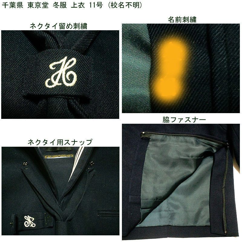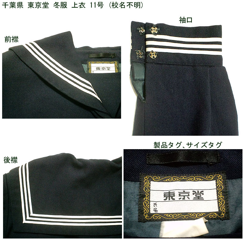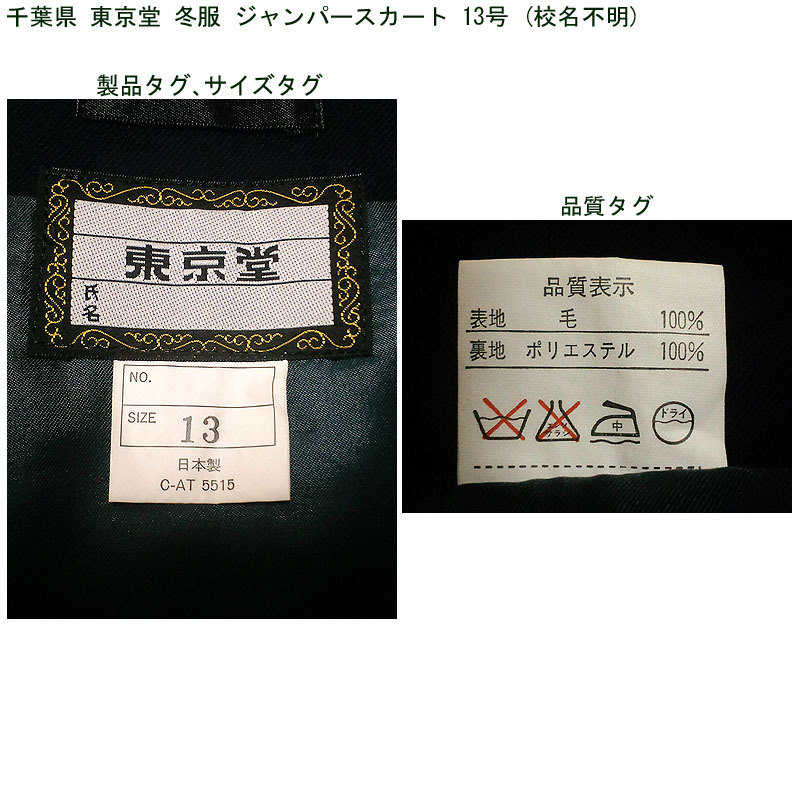 千葉県の冬服セーラー服とジャンパースカートの2点セットです。 学校名は不明です。 上下とも千葉県の東京堂製になります。 ジャンパースカートのベルトは欠品です。 発送はヤマト運輸で80サイズを予定しています。 ●商品の説明 (1)上衣 メーカー:東京堂 色/タイプ:紺地紺襟白3線長袖被り(関東襟) サイズ :11号 胸周り:108cm 肩幅:41cm 袖丈:60cm 着丈:47cm 裾周り:98cm (2)ジャンパースカート メーカー:東京堂 色 :紺 サイズ :13号 ウエスト:88cm スカート丈(ベルト下):64.5cm 胸廻り:94cm 総丈:103cm 箱ひだ 24本 ※素人採寸ですので、多少の誤差はご了承ください。 ●注意事項 (1)ガイドラインに則り、ホームクリーニング済みです。 (2)実際に着用されていた制服ですので、シミ、汚れなどがあります。 (3)折り畳んでで保管していましたので、多少シワがあります。 (4)ノークレーム、ノーリターンでお願いいたします。 (5)スムーズな取引を心がけますが、発送は週末になります。 |