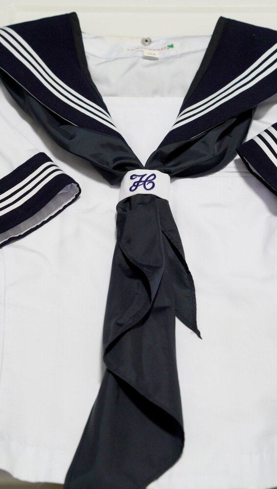 夏服の襟と袖は付け外し可能になっています。 どちらも黒いスカーフを通します。 数年間の使用感がありますが特に大きな問題ありません。ランクはBです。