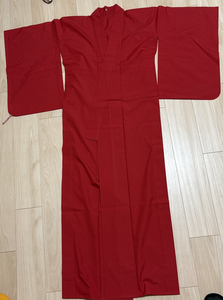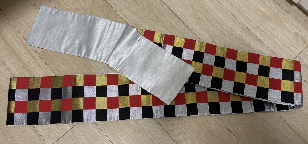 宝塚コドモアテネお勉強会用(発表会)のフィナーレで全員が着用する赤ウールきもの、市松帯の2点セットです。