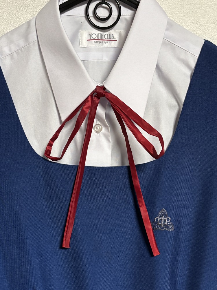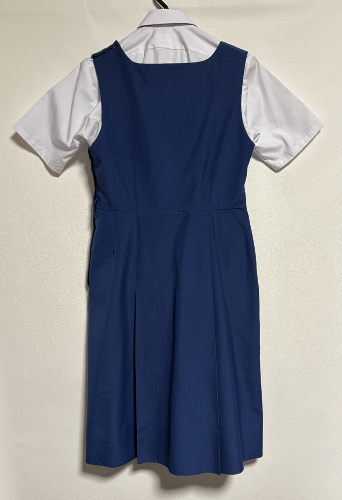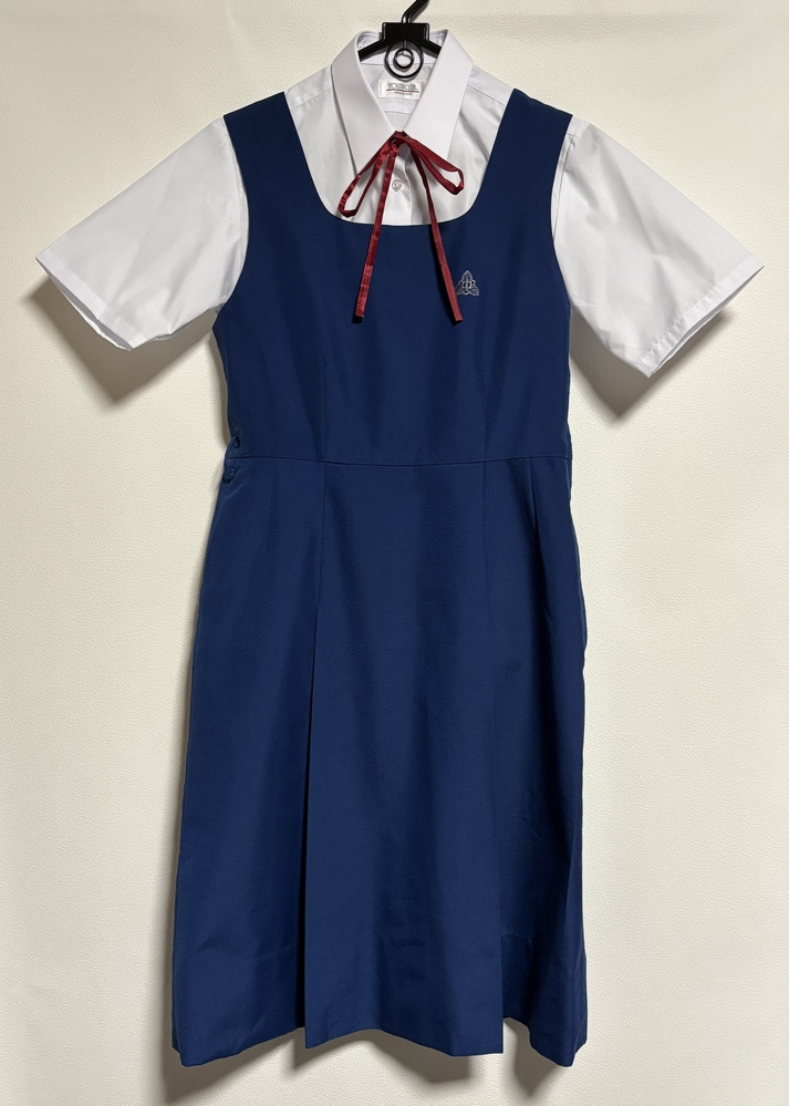 中学校(不明)の半袖シャツと青のジャンパースカートセットです。 赤い紐タイ付き 使用感あります。 サイズ ジャンパースカート ウエスト76cm 総丈101cm スカート部63cm バスト92cm ベルト無し 160A相当のサイズです。 クロネコの着払いで発送します。 |