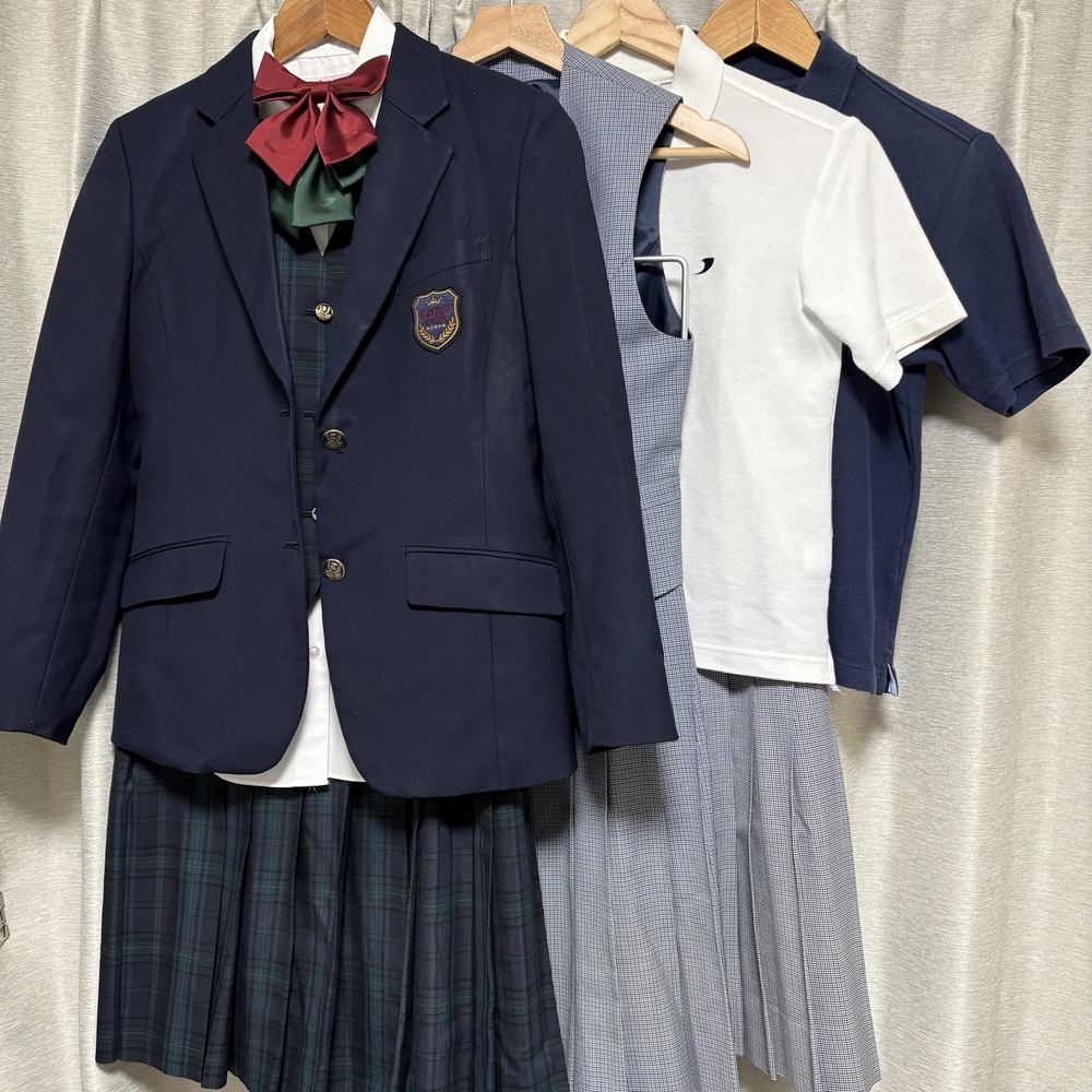 ・ブレザー 表記サイズ:SR ・ベスト(グレー) 表記サイズ:SR ・ベスト(緑) 表記サイズ:SR ・ブラウス ・ポロシャツ(白・紺) 表記サイズ:SS ・スカート(グレー)2枚 ※1枚汚れあり ウエスト 35cm ※平置き ・スカート(緑) ウエスト 35cm ※平置き |