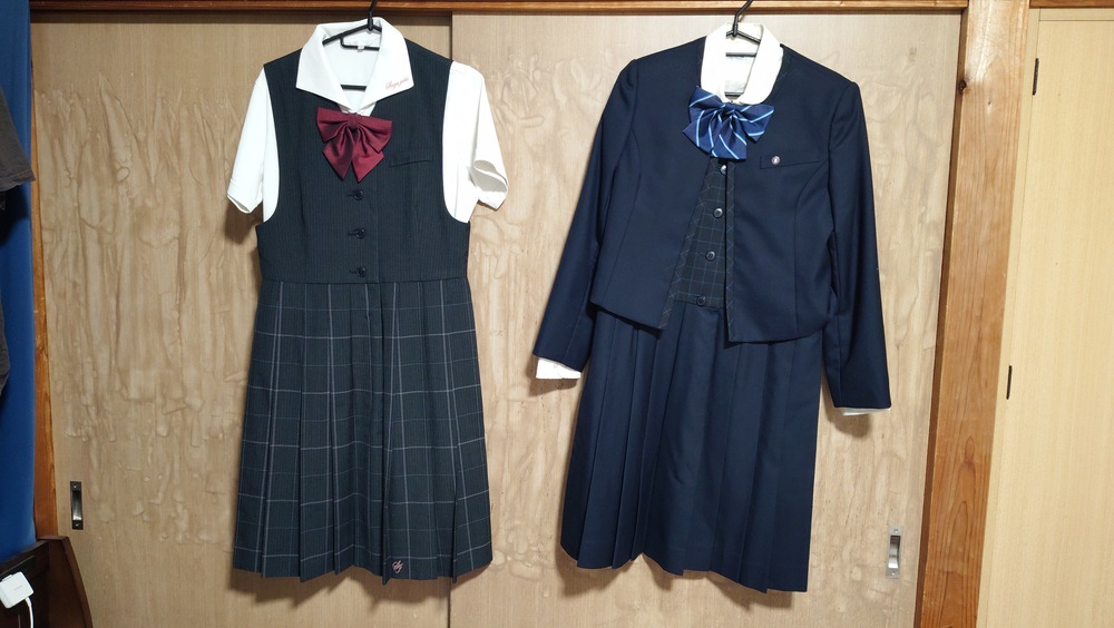 冬服 ・ボレロ 7T 着丈44cm、肩幅37cm、バスト90cm、袖丈56cm ・長袖ブラウス 肩幅41cm、身幅52cm、着丈57cm ・ジャンパースカート 13-92 着丈96cm、バスト90cm、ウエスト84cm、スカート丈50cm ・リボン ・校章 夏服 ・半袖ブラウス L 肩幅44cm、身幅55cm、着丈58cm ・ジャンパースカート 11-97 着丈98cm、バスト84cm、ウエスト78cm、スカート丈56cm ・リボン |