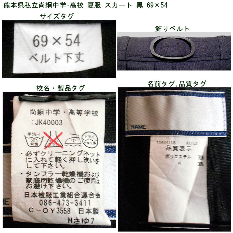 熊本県私立尚絅中学・高校の夏服スカートです。 黒基調のチェックスカートになります。 飾りベルトが付いています。 ●商品の説明 メーカー:- 色 :黒チェック サイズ :69×54 ウエスト:64〜70cm(調節可能範囲) スカート丈(ベルト下):53.5cm 車ひだ:24本 ※素人採寸ですので、多少の誤差はご了承ください。 ●注意事項 (1)ガイドラインに則り、ホームクリーニング済みです。 (2)実際に着用されていた制服ですので、シミ、汚れ、色あせなどがあります。 (3)折り畳んで保管していましたので、多少シワがあります。 (4)ノークレーム、ノーリターンでお願いいたします。 (5)スムーズな取引を心がけますが、発送は週末になります。 |