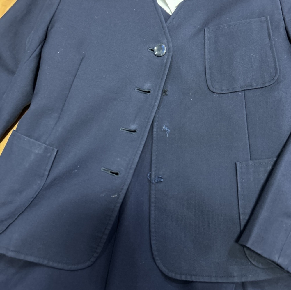 南山高校女子部の制服です。 ブレザー 9-52 長袖ブラウス Mサイズ ジャンバースカート 7号 ブレザーの前ボタン3個なし。 ジャンバースカート、画像のように穴あり。ウエストの紐は付いていません。 中古品ですので神経質な方ご遠慮ください。 |