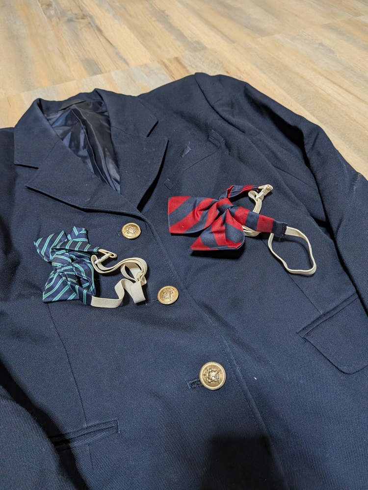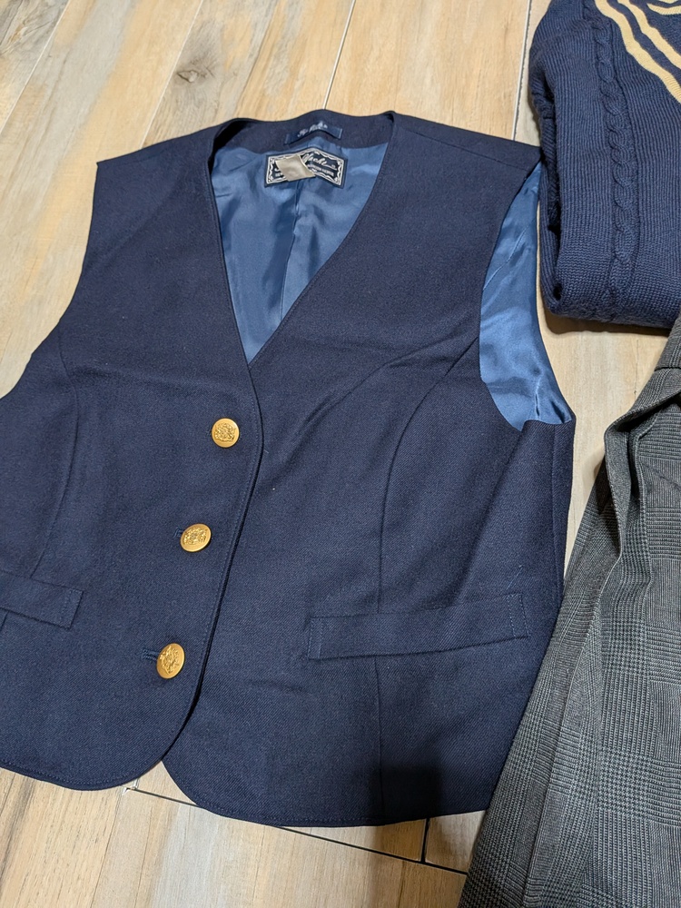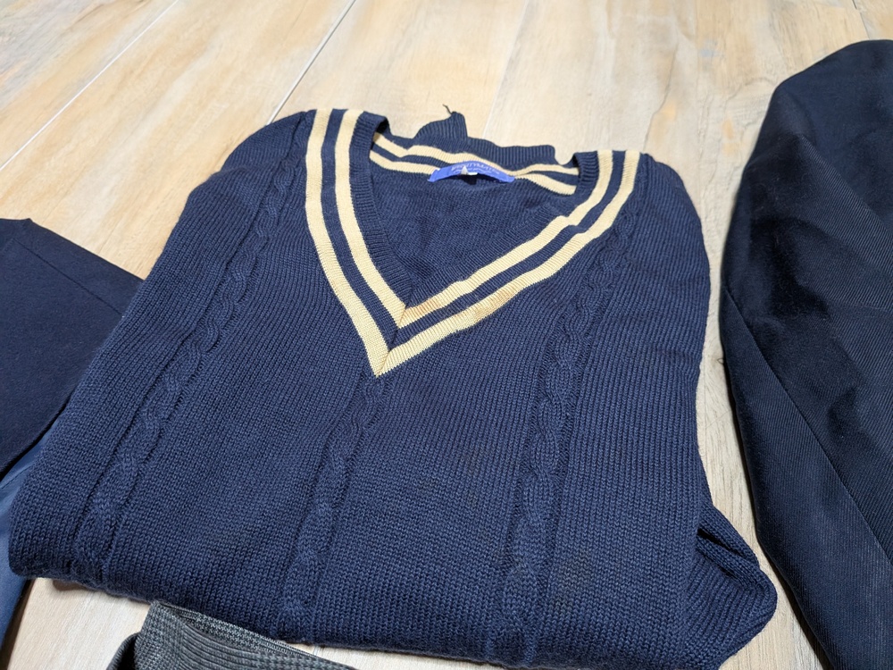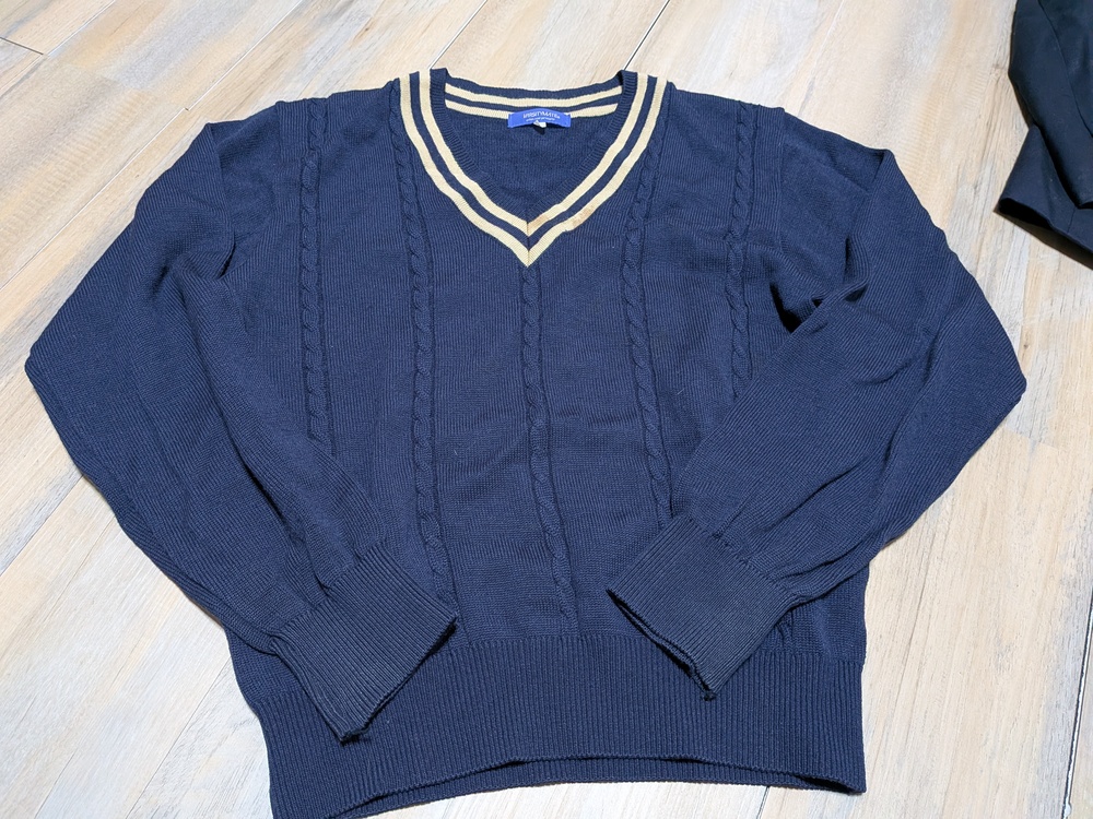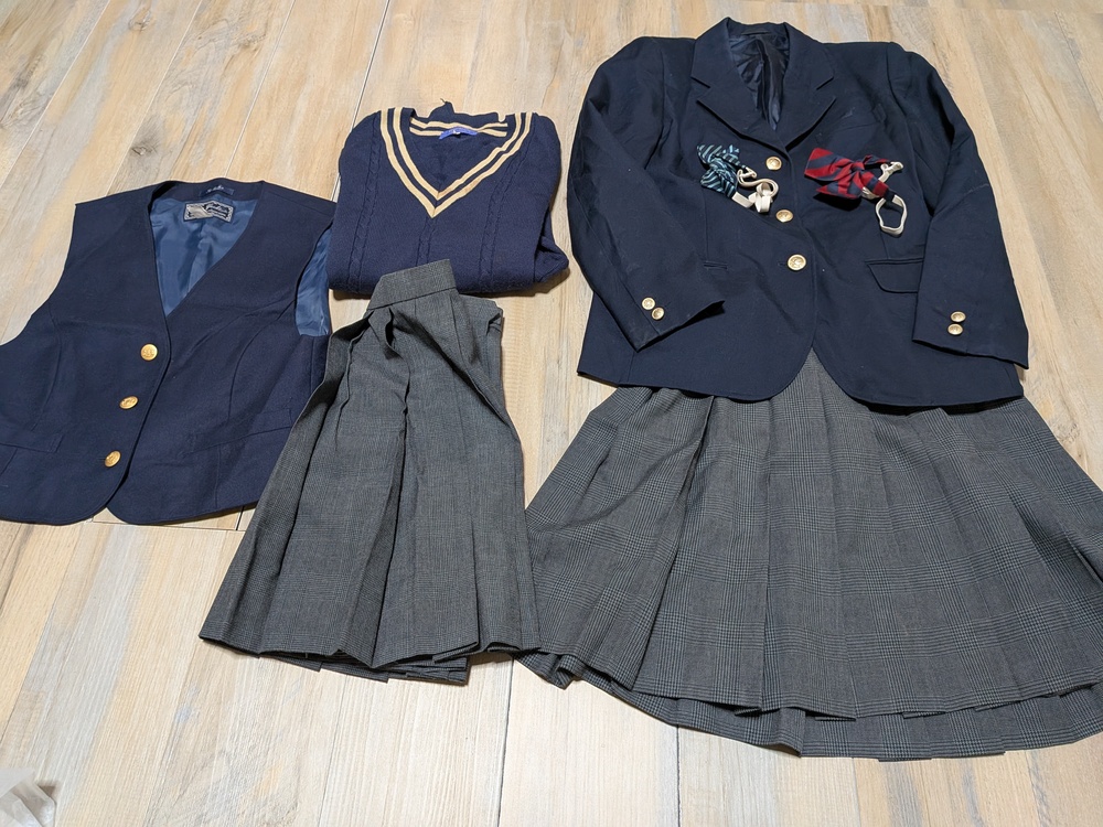 ブレザー M 多少の使用感 リボン×2 ベストM位 厚手スカート w66 丈48 薄手スカート w66 丈48 Vネックニット L 多少の使用感あり |