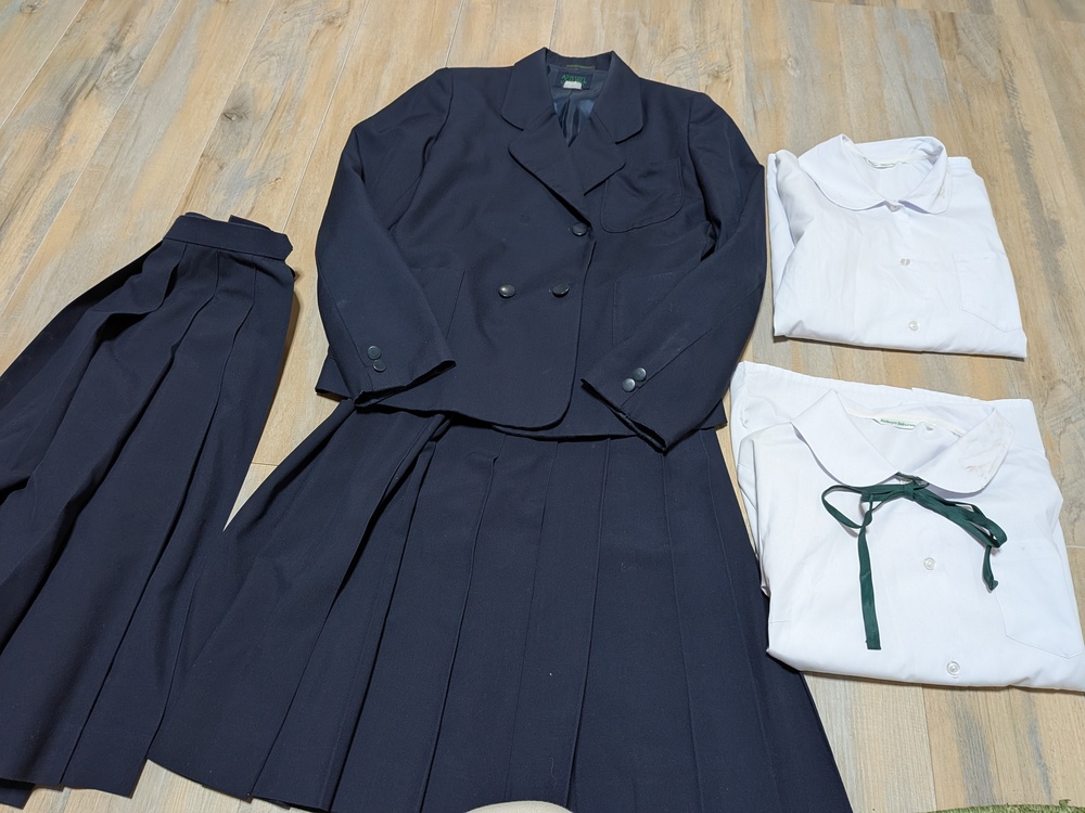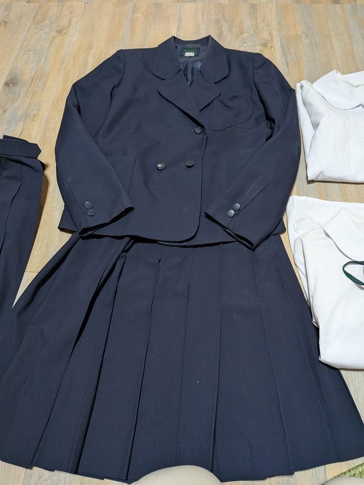 やや使用感あり ジャケット 丈60 肩幅39 脇下身幅47 脇下〜袖先44 使用感あり ボタン欠品 半袖ブラウス 2枚 多少の使用感あり リボン 薄手スカート w63 L60 厚手スカート w66 L63 |