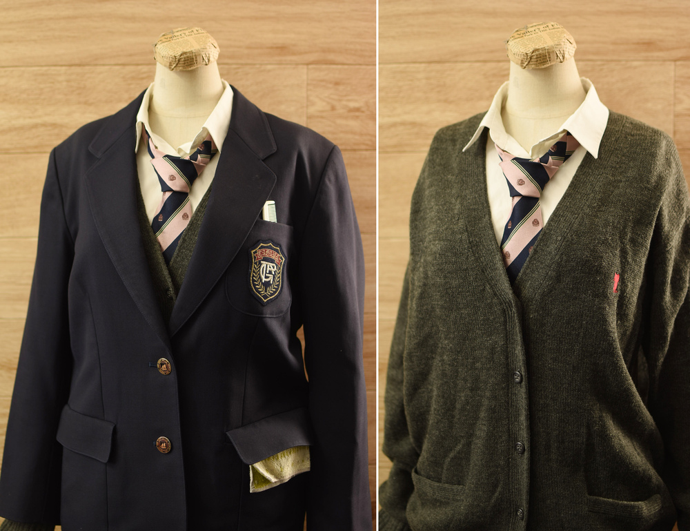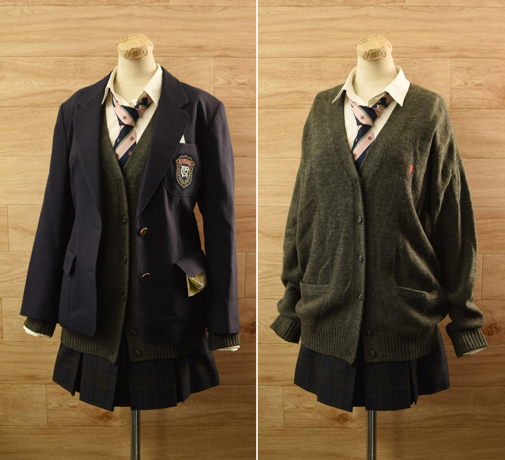 状態は実際に使用されていたものです夏スカートの三カンの位置が個人で変えてあります。ブラウスの襟に擦れ、ブレザー左袖のボタンが一つありません。着用感があります。