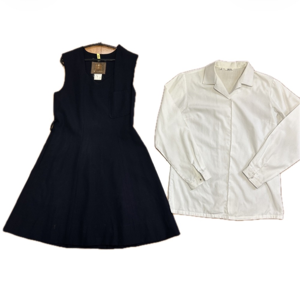 南山高校女子部の制服です。 ジャンバースカート 9号 肩幅33.身幅40.総丈84 長袖ブラウス Mサイズ 中古品ですので神経質な方ご遠慮ください。 |