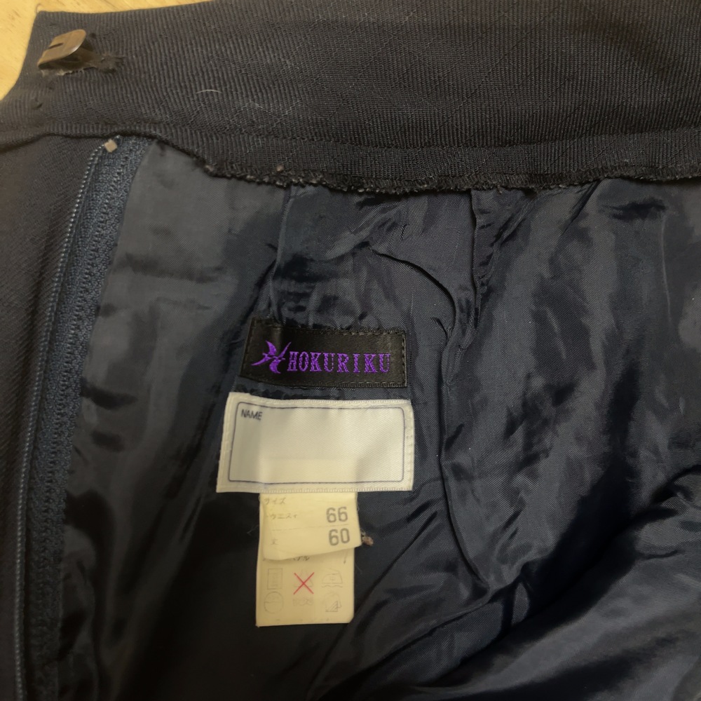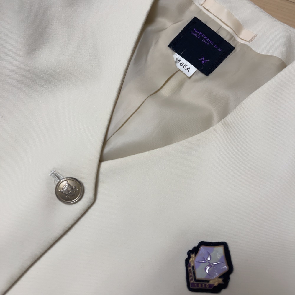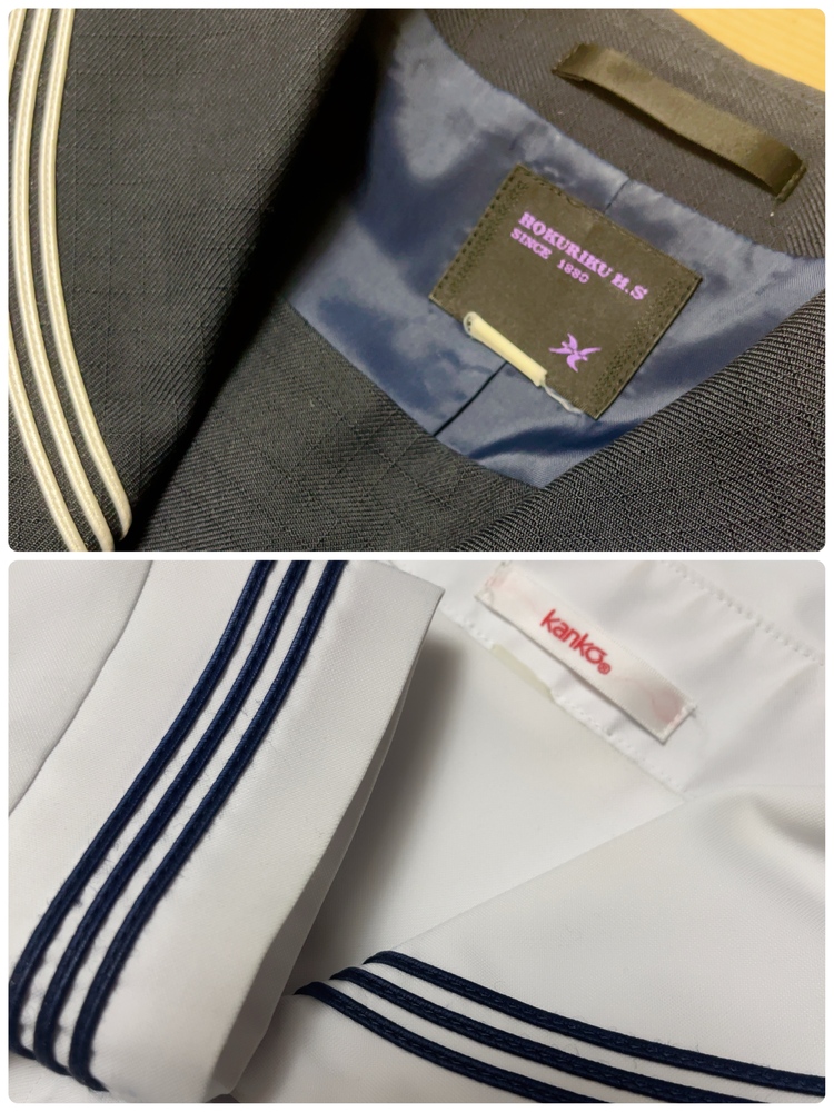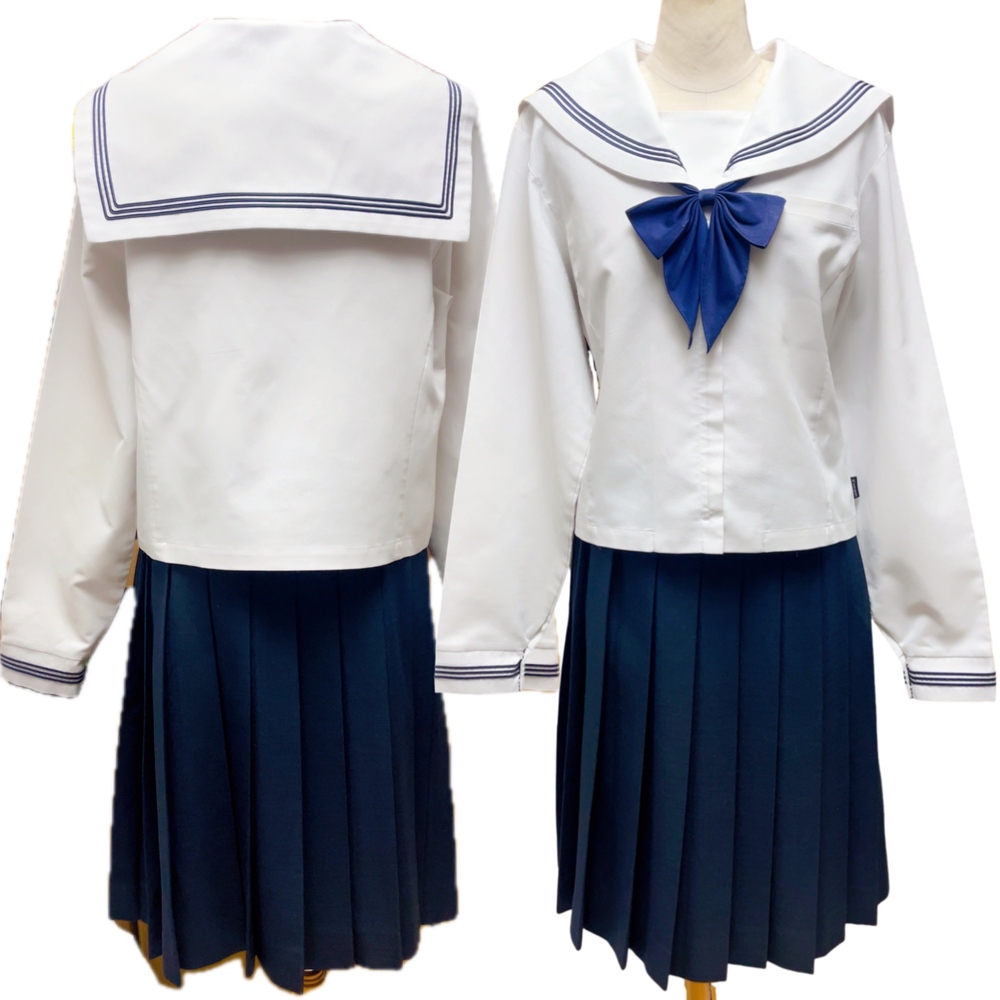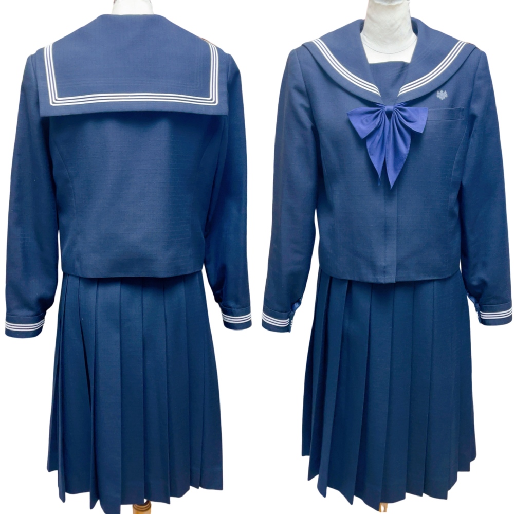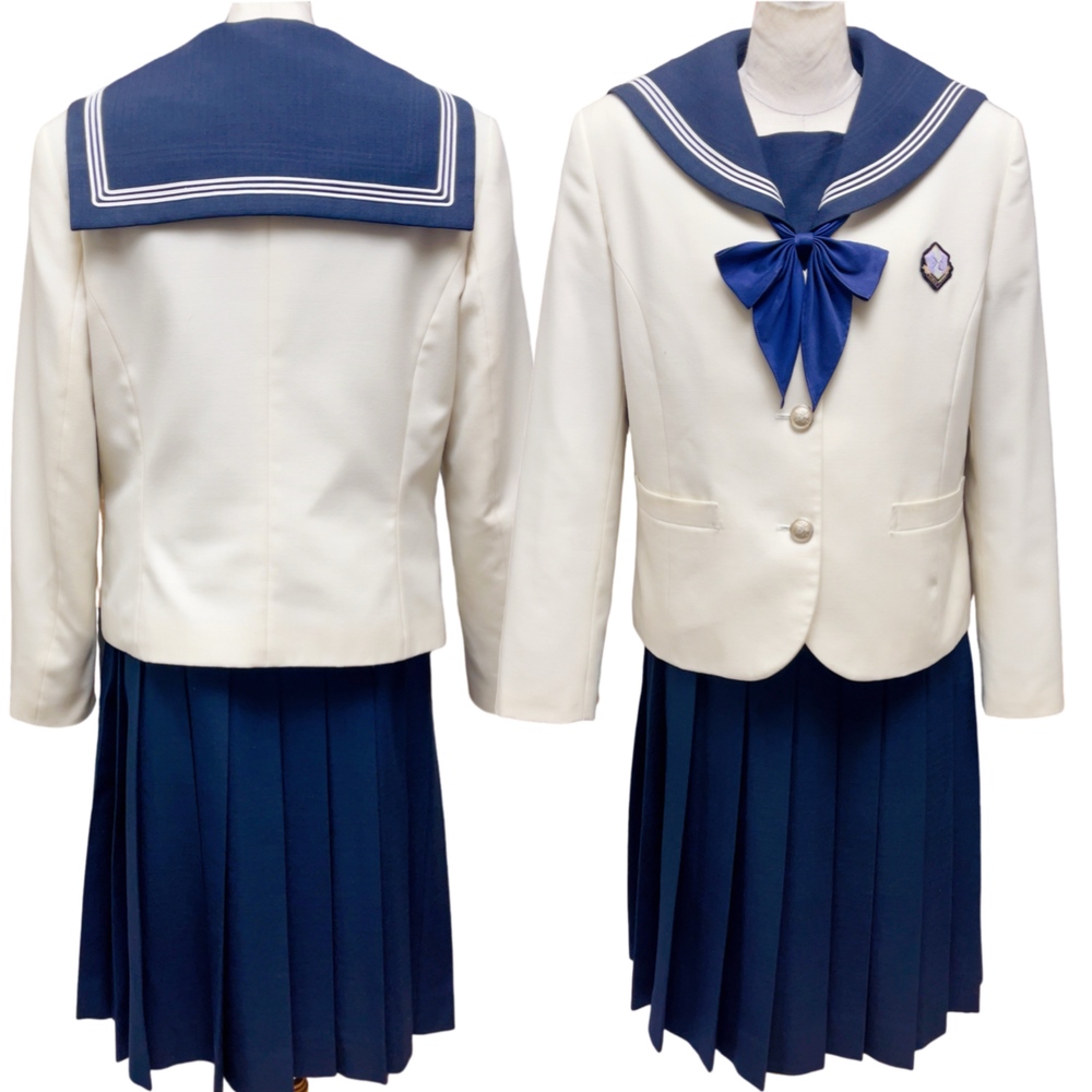 ご訪問頂き誠に有難う御座います。 ご入札前にお手数ですが必ず プロフィールをご一読下さいますよう 何卒お願いを申し上げます。 ご閲覧頂いていない場合のクレームは 受け付けておりませんので 何卒ご了承下さい。 以下発送品となります。 落ち着いたネイビーカラーを基調とした、品のあるセーラータイプの冬制服。 しっかりとした生地のジャケットに、大きなネイビーリボンが胸元を華やかに彩ります。 プリーツスカートと組み合わせることで、清楚で知的な印象を与えるデザインになっており、北陸高校らしい上品さと伝統を感じさせるスタイルです。 寒い季節でも美しいシルエットを保ちながら、学生らしい凛とした雰囲気を演出します。 春や秋の過ごしやすい季節に着用する中間服は、軽やかで動きやすいセーラースタイル。 爽やかな白のセーラーブラウスにネイビーラインが入り、胸元のリボンがアクセントとなっています。 清潔感と可愛らしさを兼ね備えたデザインで、学生生活を明るく彩る制服です。