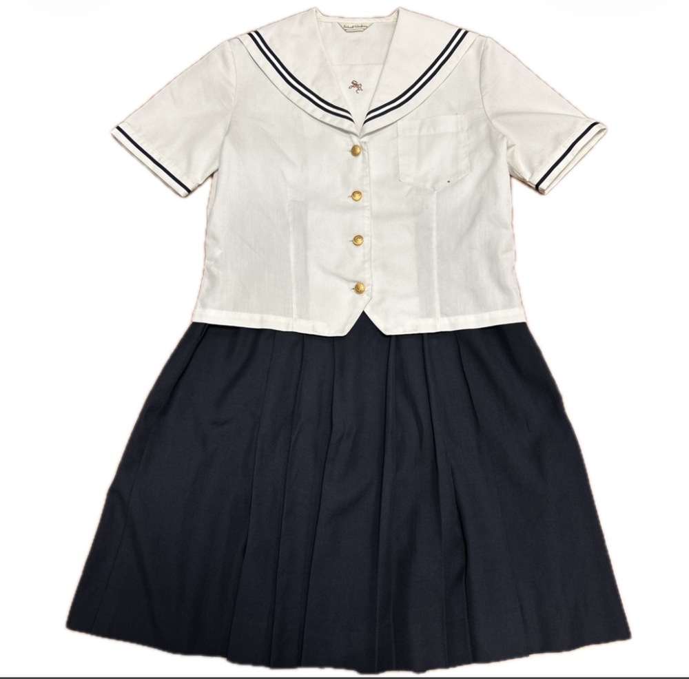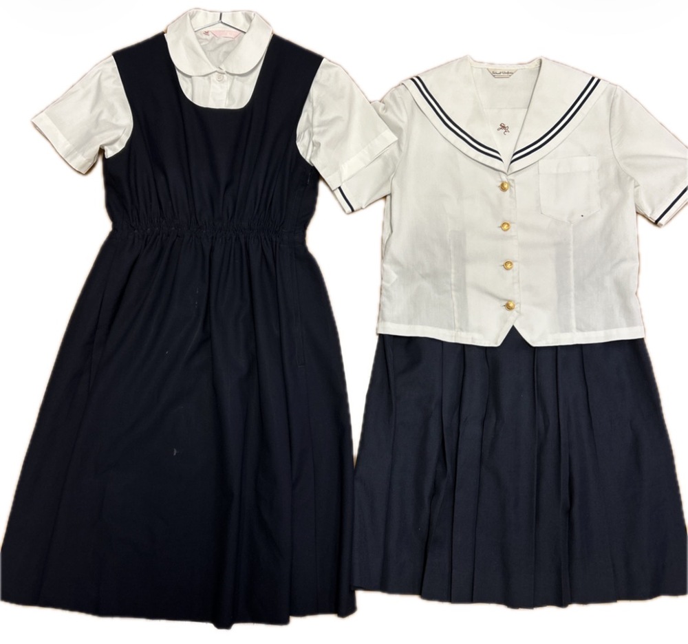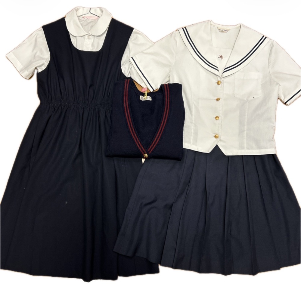 聖霊中学校・聖霊高等学校の制服です。 ◯半袖ブラウス Mサイズ ◯夏ジャンバースカート 165A ◯夏セーラー服 M〜L相当 ◯夏スカート W63.L60 ◯カーディガン Mサイズ 夏セーラー服は汚れあり、記名あり。 夏ジャンバースカートは汚れあり、スカートの部分のみ裏地あり
