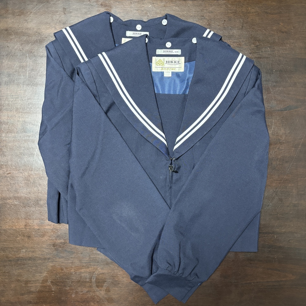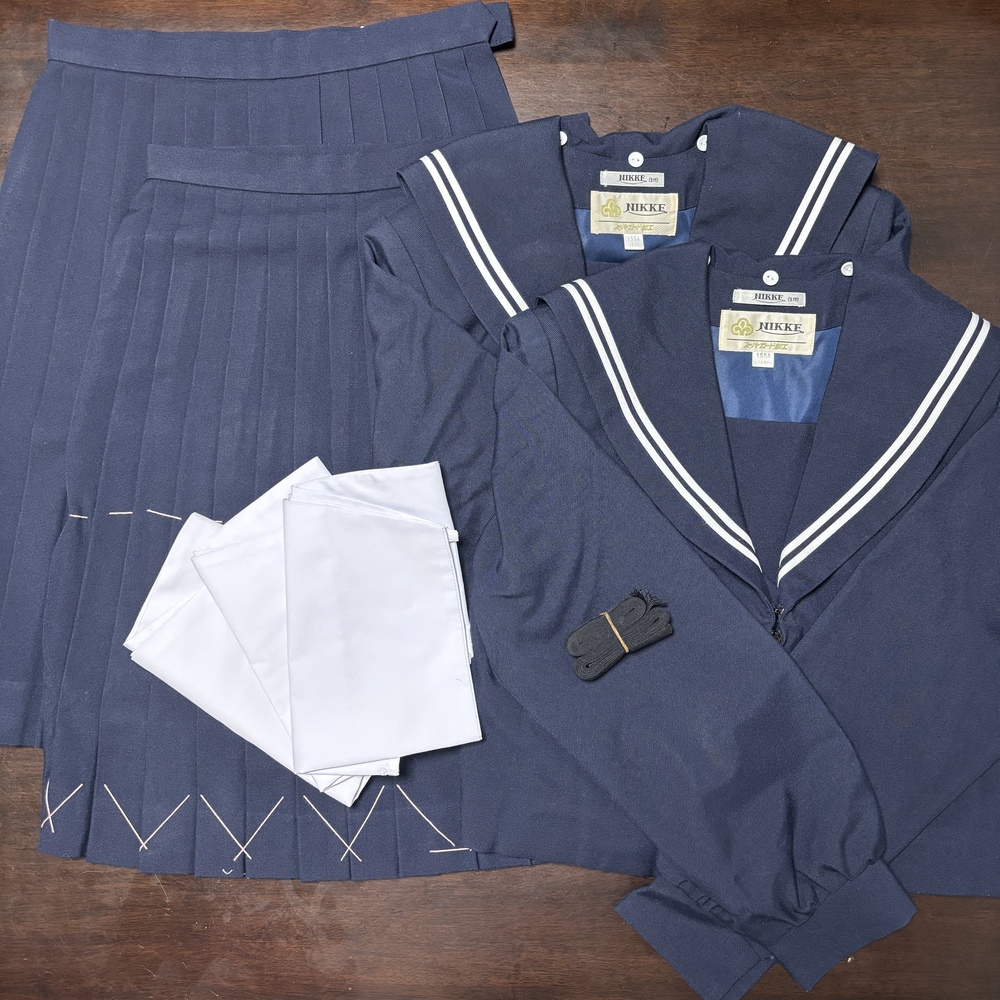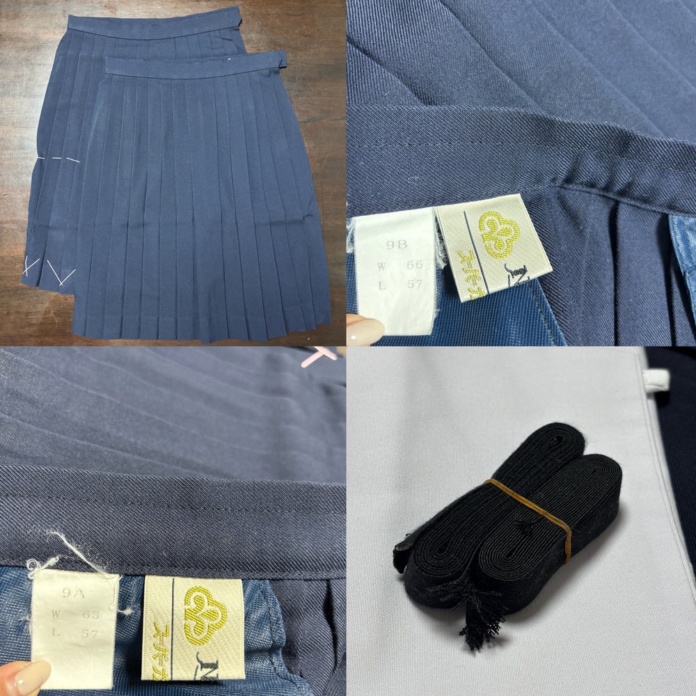 ◆冬服セーラー服 2点 (サイズ:155A) 肩幅:37.5cm 身幅:47cm 着丈:45cm 袖丈:56cm ◆冬服スカート 2点 (サイズ:9B) ウエスト:65~70cm スカート丈56cm 2枚目 (サイズ:9A) ウエスト:64~69cm スカート丈56cm ◆スクール紐タイ 2点 ◆セーラー服(冬服)替え襟 3点 (155A) |