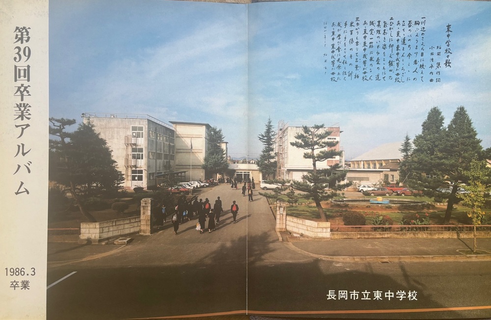 1986年 新潟県 長岡市立東中学校 卒業アルバム 全38ページ カラー/モノクロ 男女共学全7クラス(約310名) 表紙に若干のシミ箇所あり |