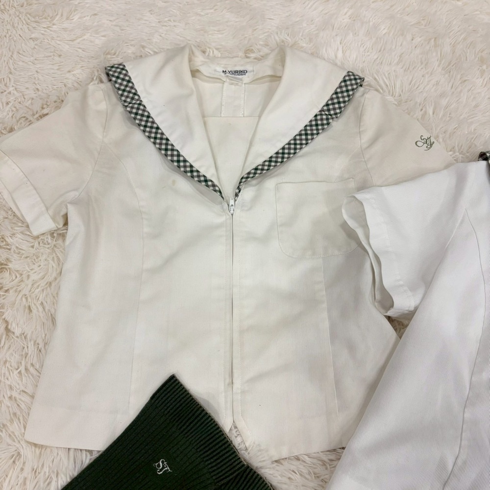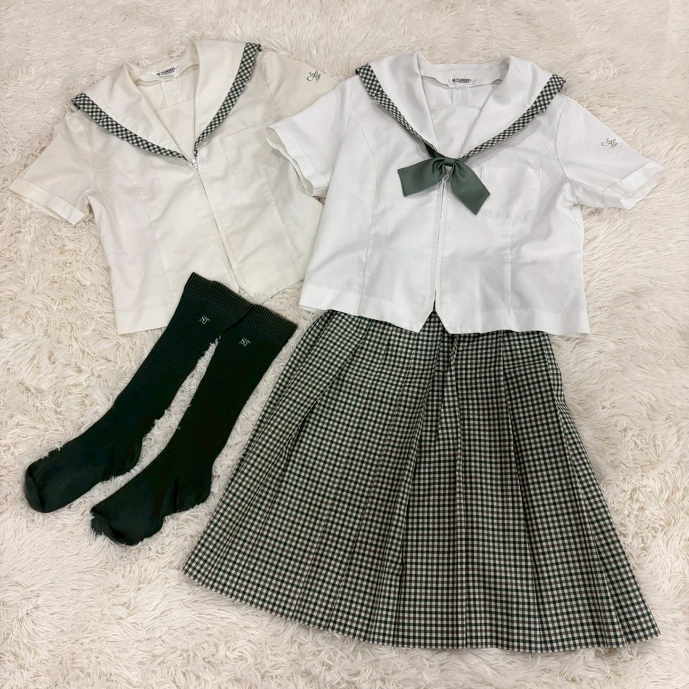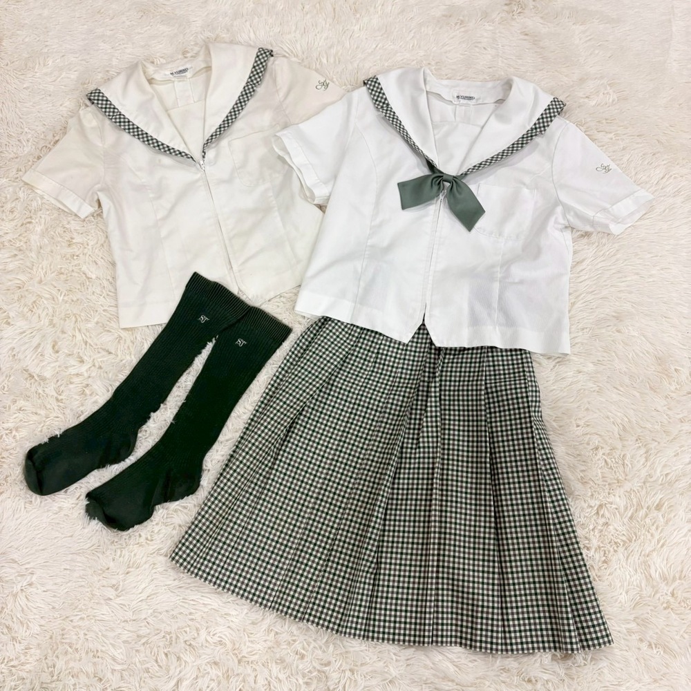 【商品説明】 福島県の名門校として知られる須賀川女子高校の夏制服セットアップです。 爽やかなホワイトトップスに、上品なグリーン系チェック柄スカートを合わせた清楚で印象的なデザイン。セーラーカラーやリボン、校章入りボタンなど細部までこだわりのある一着です。 メーカーは「M.YURIKO BY MITSUKOSHI(三越製)」で、学校指定品ならではのしっかりした作りとなっております。近年は統廃合・モデルチェンジ・卒業により市場流通数が非常に少なく、当時物の実物セットは年々希少価値が高まっています。 コレクション用途・資料保存・衣装・展示用としてもおすすめです。 【セット内容】 ・夏用セーラーブラウス 2点 ・チェックスカート ・リボン ・ソックス 【特徴】 ・須賀川女子高校モデル ・三越製 指定品 ・校章入り金ボタン ・グリーンチェック柄スカート ・セーラーカラー仕様 ・現在では入手困難な希少セット 【状態】 中古保管品です。 ブラウスに薄汚れ・シミ・黄ばみ・使用感がございます。 スカートや付属品にも保管シワ、若干の使用感があります。 ソックスは使用感あり、おまけ程度とお考えください。 年代物の実使用品としては雰囲気があり、資料価値・コレクション性の高いお品です。 状態を含め現状品としてご理解いただける方のみお願いいたします。 【おすすめ用途】 ・制服コレクション ・学校資料保存 ・撮影衣装 ・展示ディスプレイ ・ヴィンテージ制服収集 【希少性について】 学校指定制服は一般販売されず、卒業や廃棄で現存数が減少しております。 さらに上下揃い・付属品付き・メーカータグ確認可能な個体は非常に珍しく、今後も入手機会は限られると思われます。 【発送方法】 防水梱包のうえ丁寧に発送いたします。 #MU |