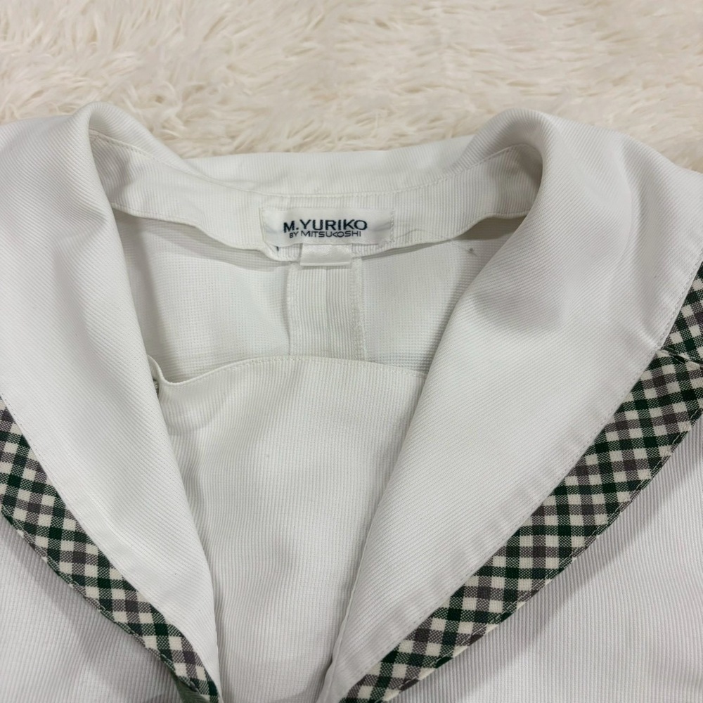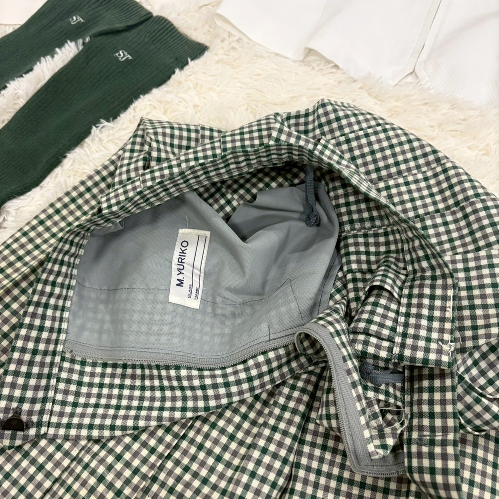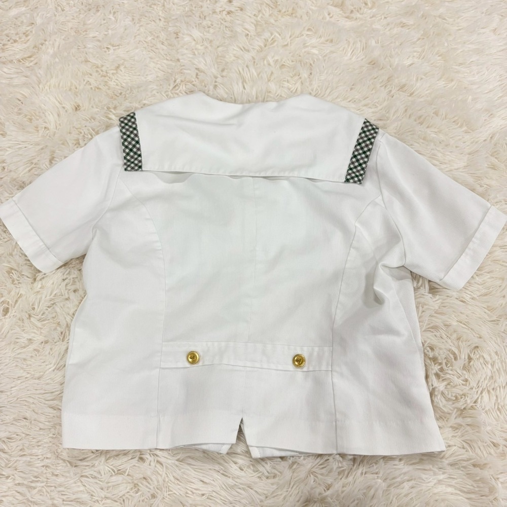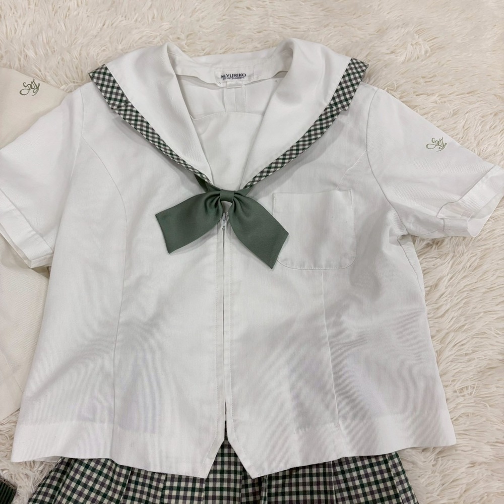 【商品説明】 福島県の名門校として知られる須賀川女子高校の夏制服セットアップです。 爽やかなホワイトトップスに、上品なグリーン系チェック柄スカートを合わせた清楚で印象的なデザイン。セーラーカラーやリボン、校章入りボタンなど細部までこだわりのある一着です。 メーカーは「M.YURIKO BY MITSUKOSHI(三越製)」で、学校指定品ならではのしっかりした作りとなっております。近年は統廃合・モデルチェンジ・卒業により市場流通数が非常に少なく、当時物の実物セットは年々希少価値が高まっています。 コレクション用途・資料保存・衣装・展示用としてもおすすめです。 【セット内容】 ・夏用セーラーブラウス 2点 ・チェックスカート ・リボン ・ソックス 【特徴】 ・須賀川女子高校モデル ・三越製 指定品 ・校章入り金ボタン ・グリーンチェック柄スカート ・セーラーカラー仕様 ・現在では入手困難な希少セット 【状態】 中古保管品です。 ブラウスに薄汚れ・シミ・黄ばみ・使用感がございます。 スカートや付属品にも保管シワ、若干の使用感があります。 ソックスは使用感あり、おまけ程度とお考えください。 年代物の実使用品としては雰囲気があり、資料価値・コレクション性の高いお品です。 状態を含め現状品としてご理解いただける方のみお願いいたします。 【おすすめ用途】 ・制服コレクション ・学校資料保存 ・撮影衣装 ・展示ディスプレイ ・ヴィンテージ制服収集 【希少性について】 学校指定制服は一般販売されず、卒業や廃棄で現存数が減少しております。 さらに上下揃い・付属品付き・メーカータグ確認可能な個体は非常に珍しく、今後も入手機会は限られると思われます。 【発送方法】 防水梱包のうえ丁寧に発送いたします。 #MU |